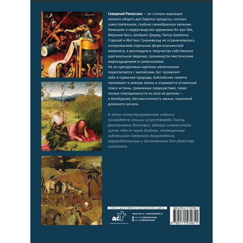 От Босха до Брегейля. Любимые картины. Северный Ренессанс - не столько вариация некоего общего для Европы процесса, сколько самостоятельное, глубоко своеобразное явление. Немецкие и нидерландские художники Ян ван Эйк, Иероним Босх, Альбрехт Дюрер, Питер Брейгель Старший и Маттиас Грюневальд не ограничивались копированием отдельных форм итальянской живописи, а воплощали в творчестве собственное оригинальное ви дение, проникнутое мистическим мироощущением и символизмом. На их причудливых картинах религиозное переплетается с житейским, Бог проявляет себя в гармонии природы, библейские сюжеты проникают в земную жизнь и отражается отчаянный поиск истины, тревожные предчувствия, тихая поэзия повседневности во всех ее деталях - и безобразие, бессмысленность жизни, лишенной духовного начала. В этом иллюстрированном издании приводятся лекции искусствоведа Паолы Дмитриевны Волковой, автора знаменитого цикла "Мост через бездну", посвященные художникам Северного Возрождения, переработанные и дополненные для удобства читателя. Книга для тех, кто ценит искусств