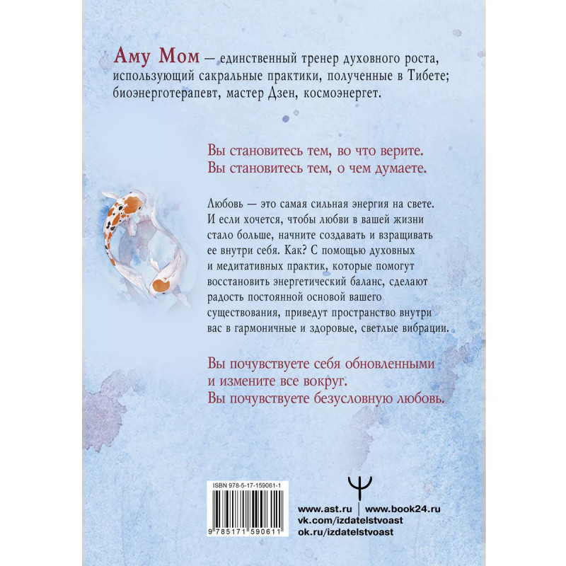 Книга Любви. Открой секрет Силы и Спокойствия. Аму Мом - единственный тренер духовного роста, использующий сакральные практики, полученные в Тибете; биоэнерготерапевт, мастер Дзен, космоэнергет. Вы становитесь тем, во что верите. Вы становитесь тем, о чем думаете. Никогда не наступит мoмент, когда вы станете настолько мудрыми, опытными и успешными, чтобы ни в чем не ошибиться. Важно научиться делать правильные выводы из ошибок, уметь исцелять себя и наполнять любовью. Все, что происходит с нами, приятное и неприятное, то, что нравится и не нравится, хорошее и пл.оxое, все в жизни смешано и имеет свое отражение в каждом из нас, несет свое послание и свой урок. Любовь - это самая сильная энергия на свете. И если хочется, чтобы любви в вашей жизни стало больше, начните создавать и взращивать ее внутри себя. Как? С помощью духовных и медитативных практик, которые помогут восстановить энергетический баланс, сделают радость постоянной основой вашего существования, приведут пространство внутри вас в гармоничные и здоровые, светлые вибрации. Вы почувствуете себя о