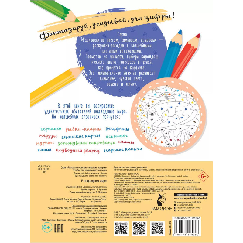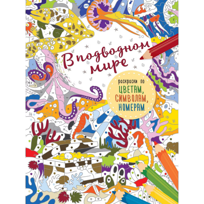 В подводном мире. Серия "Раскраски по цветам, символам, номерам" - раскраски-загадки с волшебными цветными подсказками. Посмотри на палитру, выбери карандаш нужного цвета, раскрась и узнай, кто прячется на картинке. Это увлекательное занятие развивает внимание, чувство цвета, память и логику. В этой книге ты раскрасишь удивительных обитателей подводного мира. На волшебных страницах прячутся: черепахи, рыбки-клоуны, дельфины, медузы, японские карпы, скаты затонувшие сокровища, осьминог, киты, подводный дворец, мурены, морские коньки.