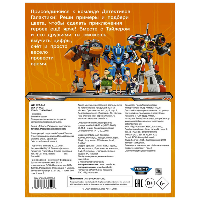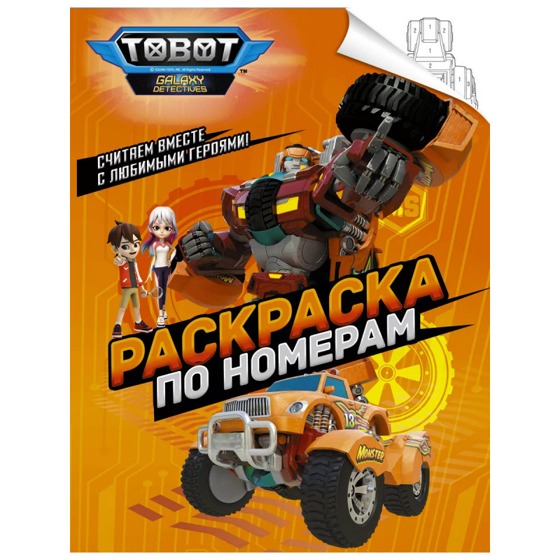Тоботы. Раскраска по номерам (оранжевая). Присоединяйся к команде Детективов Галактики! Реши примеры и подбери цвета, чтобы сделать приключения героев ещё ярче! Вместе с Тайлером и его друзьями ты сможешь выучить цифры, счёт и просто весело провести время.