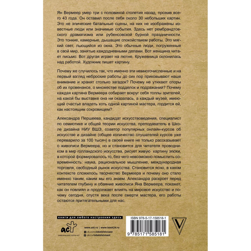 Время Вермеера. Загадочный гений Барокко и заря Новейшего времени. Ян Вермеер умер три с половиной столетия назад, прожив всего 43 года. Он оставил после себя около 3 небольших картин. Это не эпипческие батальные сцены, на них не изображены известные люди или значимые события. Здесь нет рембрандтовского драматизма или рубенсовской бурной праздничности. Это тонкие, камерные, дышащие спокойствием работы. Это мягкий свет, льющийся из окна. Это обычные людим, погруженные в свой мир, занятые каждодневными делами. Вот женщина читает письмо. Вот другая играет на лютне. Кружевница склонилась над работой. Художник пишет картину. Почему же случилось так, что именно эти немногочисленные и на первый взгляд неброские работы до сих пор приковывают наше внимание и хранят столько загадок? Почему не утихают споры об их провенансе, о множестве подделок и подражаний? Почему каждая картина Вермеера собирает вокруг себя толпы зрителей, на какой бы выставке она ни оказалась, а каждый музей, имеющий счастье владеть хоть одной картиной мастера, гордится ей, как настоящим сокровищем? Александра Перш