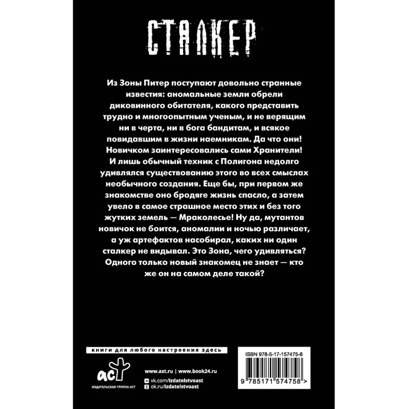 Зона Питер. Сбой системы. Из Зоны Питер поступают довольно странные известия: аномальные земли обрели диковинного обитателя, какого представить трудно и многоопытным ученым, и не верящим ни в черта, ни в бога бандитам, и всякое повидавшим в жизни наемникам. Да что они! Новичком заинтересовались сами Хранители! И лишь обычный техник с Полигона недолго удивлялся существованию этого во всех смыслах необычного создания. Еще бы, при первом же знакомстве оно бродяге жизнь спасло, а затем увело в самое страшное место этих и без того жутких земель - Мраколесье! Ну да, мутантов новичок не боится, аномалии и ночью различает, а уж артефактов насобирал, каких ни один сталкер не видывал. Это Зона, чего удивляться? Одного только новый знакомец не знает - кто же он на самом деле такой?
