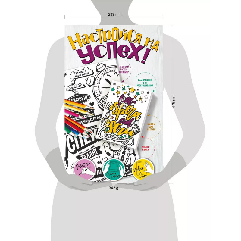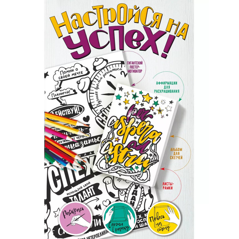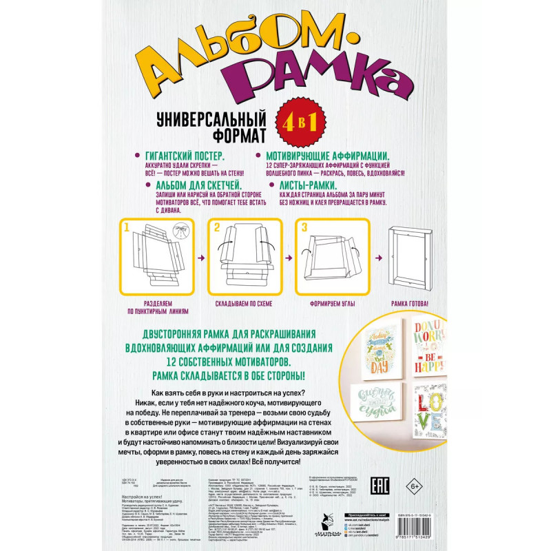 Настройся на успех! Мотиваторы, притягивающие удачу. Гигантский альбом-рамка - формат альбома для быстрого оформления стен рисунками, не требующий дополнительных вложений. Рисунки сразу складываются в готовую рамку! В альбоме плотная бумага - можно рисовать фломастерами, гелиевыми ручками, карандашами. Универсальный формат для творчества. Без ножниц и клея твоя работа в 3 шага складывается в рамку, которую легко повесить на стену. Двухсторонняя рамка для 12 мотиваторов или 12 собственных рисунков. Выбирай! Рамка складывается в обе стороны! Рисуй с одной стороны или раскрашивай с другой. Настройся на успех! Превращай мечты в цели! Рисуй свои желания, раскрашивай мотиваторы, наполняя своей энергией. Вдохновляйся! Повесь свои заряженные позитивом работы на стену, смотри на них каждый день - настраивайся на победу!