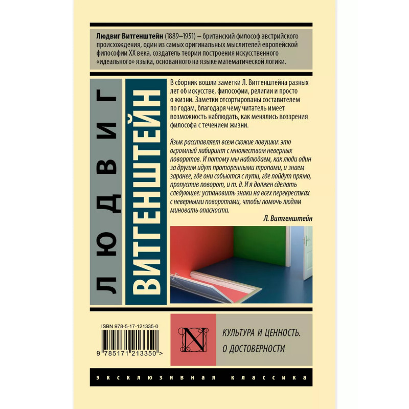 Культура и ценность. О достоверности. Людвиг Витгенштейн (1889-1951) - британский философ австрийского происхождения, один из самых оригинальных мыслителей европейской философии ХХ века, создатель теории построения искусственного "идеального" языка, основанного на языке математической логики. В сборник вошли заметки Л. Витгенштейна разных лет об искусстве, философии, религии и просто о жизни. Заметки отсортированы составителем по годам, благодаря чему читатель имеет возможность наблюдать, как менялись воззрения философа с течением жизни.