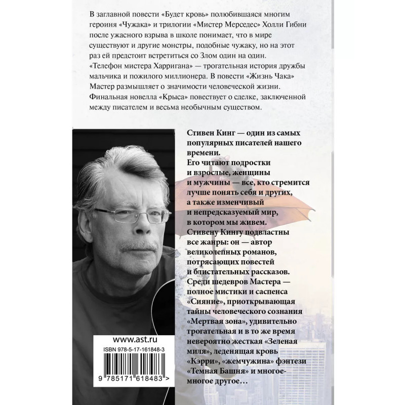Будет кровь. Стивен Кинг - писатель, любящий традиции. И одна из самых прекрасных и почитаемых миллионами его фанатов традиций - это публикация сборников, неизменно состоящих из четырех повестей. Так, мы все хорошо знакомы с книгами "Четыре сезона", "Четыре после полуночи", "Тьма, - и больше ничего". И на сей раз Стивен Кинг представляет читателям именно такой сборник, где каждое произведение погружает нас в свою неповторимую и загадочную атмосферу. В заглавной повести "Будет кровь" полюбившаяся многим героиня "Чужака" и трилогии "Мистер Мерседес" Холли Гибни после ужасного взрыва в школе понимает, что в мире существуют и другие монстры, подобные чужаку, но на этот раз ей предстоит встретиться со Злом один на один. "Телефон мистера Харригана" - трогательная история дружбы мальчика и пожилого миллионера. В повести "Жизнь Чака" Мастер размышляет о значимости человеческой жизни. Финальная новелла "Крыса" повествует о сделке, заключенной между писателем и весьма необычным существом.