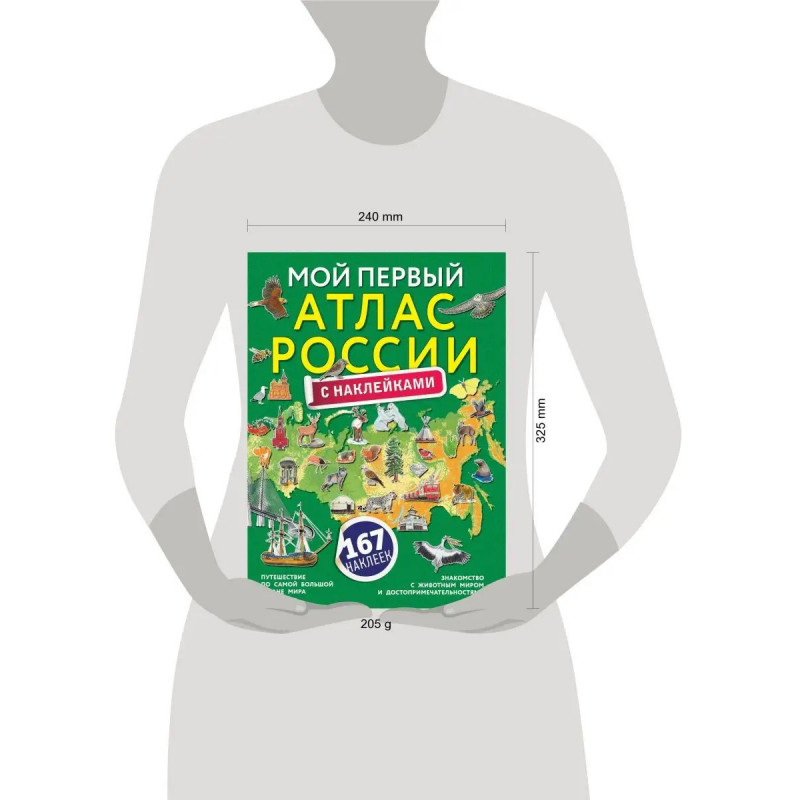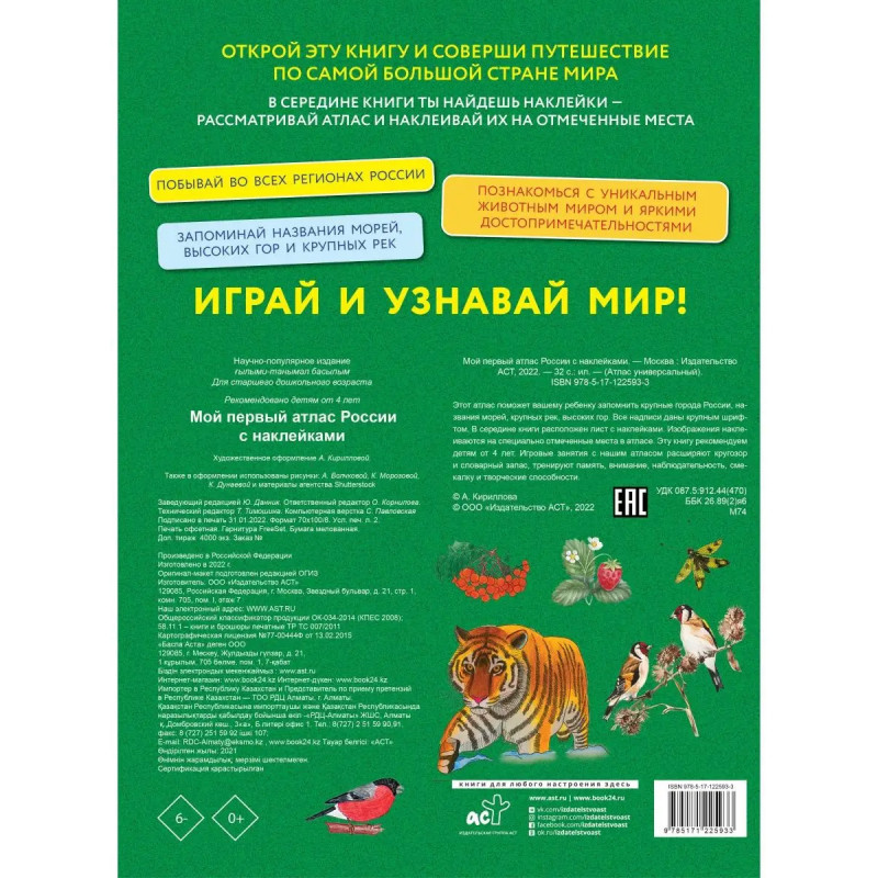 Открой атлас и соверши путешествие по самой большой стране нашей планеты. В середине книги размещен лист с наклейками - рассматривай атлас и наклеивай изображения на отмеченные места. Побывай во всех регионах России. Познакомься с уникальным животным миром, народными промыслами и яркими достопримечательностями нашей страны. Запоминай названия морей, крупных рек и горных систем. Надписи в атласе даны крупным шрифтом. Атлас рекомендуем детям от 4 лет. Игровые занятия с нашим атласом расширяют кругозор и словарный запас, тренируют память, внимание, наблюдательность, смекалку и творческие способности.