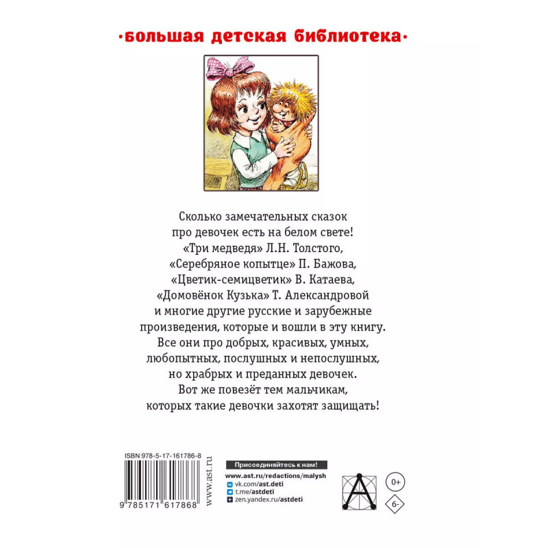 Сказки для девочек. Сколько замечательных сказок про девочек есть на белом свете! "Три медведя" Л.Н. Толстого, "Серебряное копытце" П. Бажова, "Цветик-семицветик" В. Катаева, "Домовёнок Кузька" Т. Александровой и многие другие русские и зарубежные произведения, которые и вошли в эту книгу. Все они про добрых, красивых, умных, любопытных, послушных и непослушных, но храбрых и преданных девочек. Вот же повезёт тем мальчикам, которых такие девочки захотят защищать!