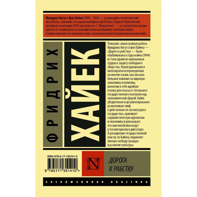 Пожалуй, самая громкая работа Фридриха Августа фон Хайека "Дорога к рабству" была опубликована в годы войны (1944) и стала одним из признанных трудов в защиту свободного общества. Многократно переиздававшая и переведенная на многие языки, она оказала большое влияние на мировую экономику и политику, воплотив в себе идейную основу для отказа от тотального государственного контроля над экономической сферой. Хайек убедительно и аргументированно развенчивает миф о действенности "всемогущего государства", критикует социалистическую идеологию и экономику и доказывает, что они неизбежно ведут к тоталитаризму и диктатуре. А расширение государственной власти, по Хайеку, подавляет личную свободу граждан и развитие культуры.