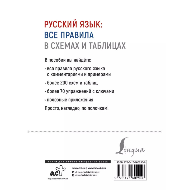 Русский язык: все правила в схемах и таблицах. В этой книге исчерпывающе изложены основные правила русской орфографии и пунктуации. Материал наглядно представлен в схемах и таблицах, что облегчает восприятие информации и делает процесс обучения более эффективным. Каждая тема завершается несколькими упражнениями для повторения и закрепления пройденного, а в конце книги даны ключи для самопроверки. Кроме того, в приложениях дан легко усваиваемый материал по орфоэпическим нормам. Издание адресовано всем, кто изучает русский язык или просто хочет сделать свою устную и письменную речь грамотной.