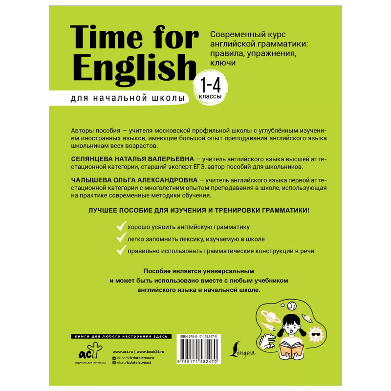 Time for English 1-4. Современный курс английской грамматики: правила, упражнения, ключи (для началь. Селянцева Наталья Валерьевна - учитель английского языка высшей аттестационной категории, старший эксперт ЕГЭ, автор пособий для школьников. Чалышева Ольга Александровна - учитель английского языка первой аттестационной категории с многолетним опытом преподавания в школе, использующая на практике современные методики обучения. Данный курс состоит из 100 эффективных уроков, в которых планомерно представлены все грамматические и лексические темы, изучаемые в начальной школе. В каждом уроке вы найдете 6 новых слов с наглядными иллюстрациями, 1 грамматическую тему, ряд упражнений для отработки лексики и грамматики, а также текст с заданием для развития навыков чтения. Книга станет отличным подспорьем младшему школьнику и незаменимым помощником как заботливым родителям, так и успешным педагогам. Пособие является универсальным и может быть использовано вместе с любым учебником английского языка в начальной школе.