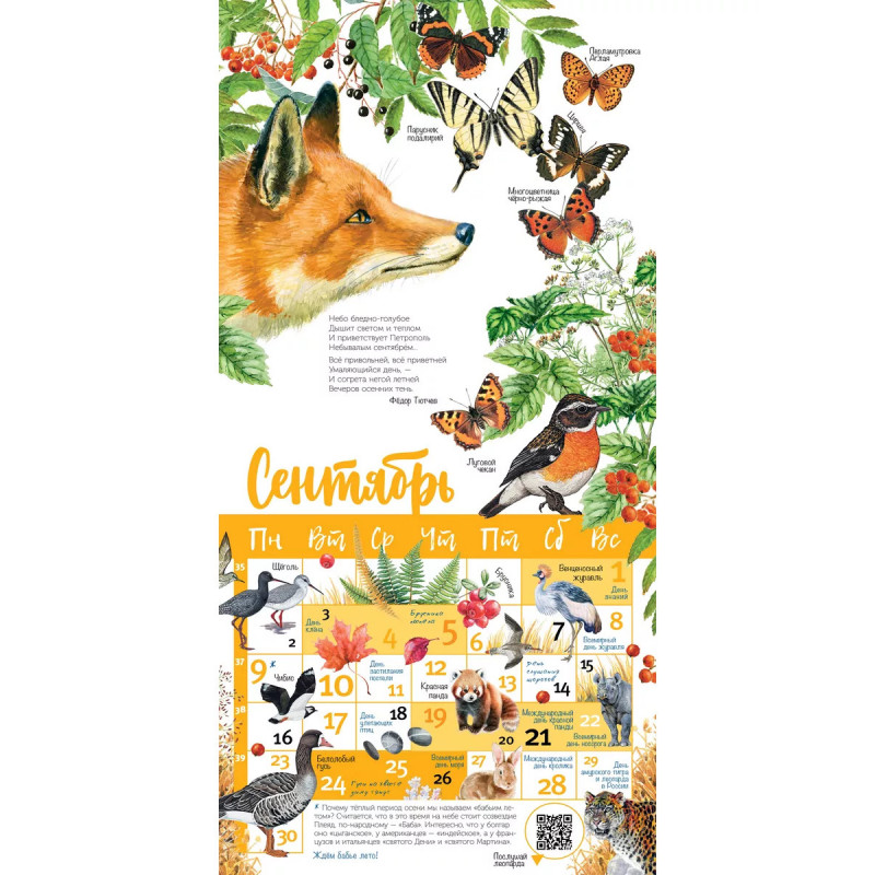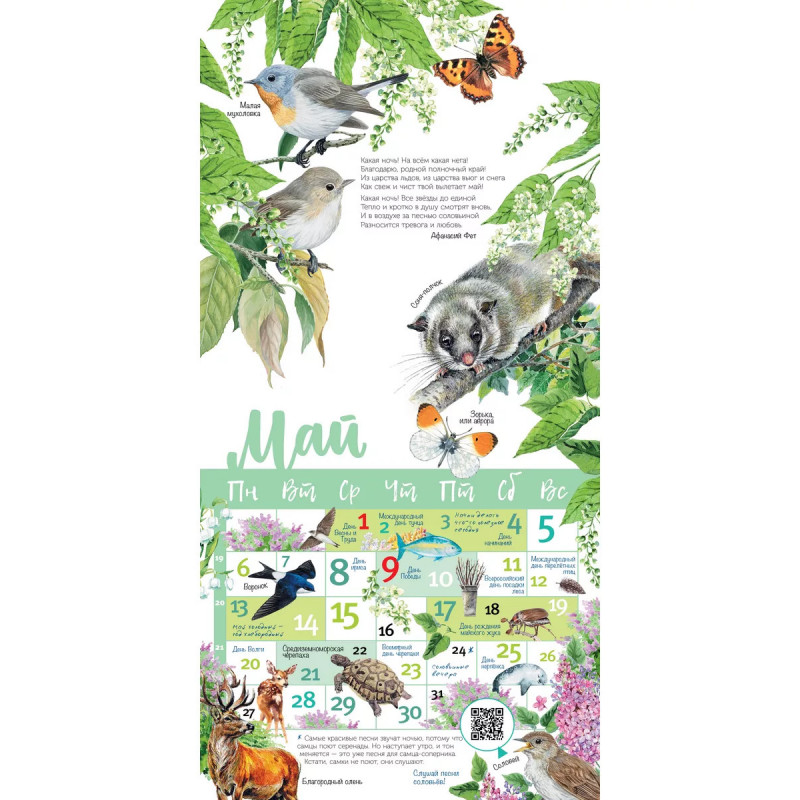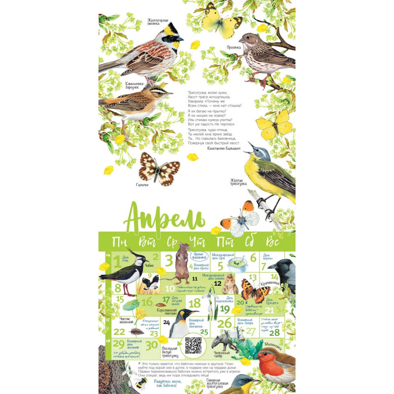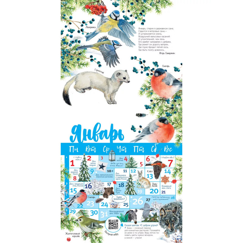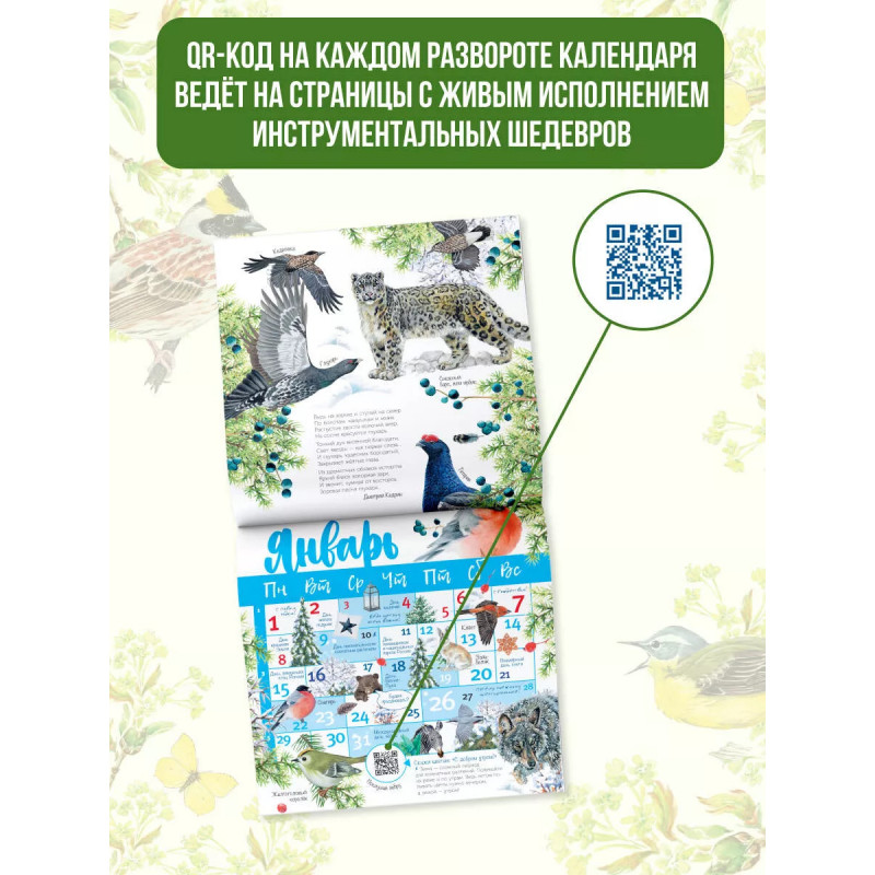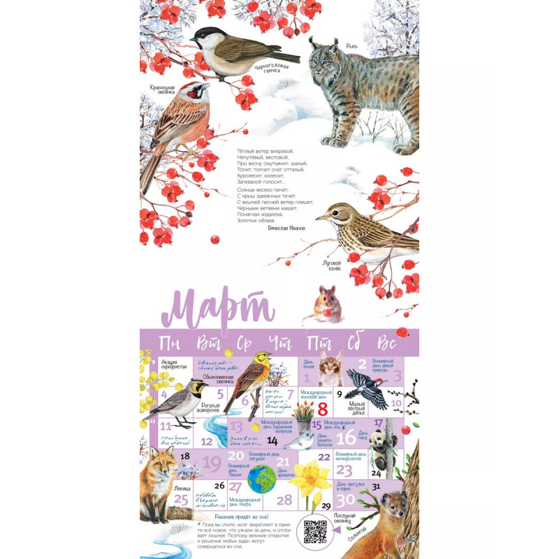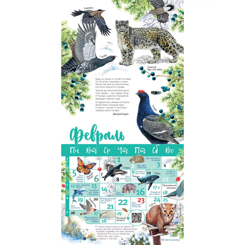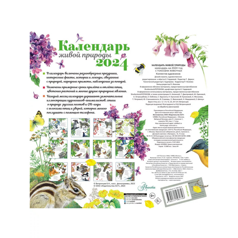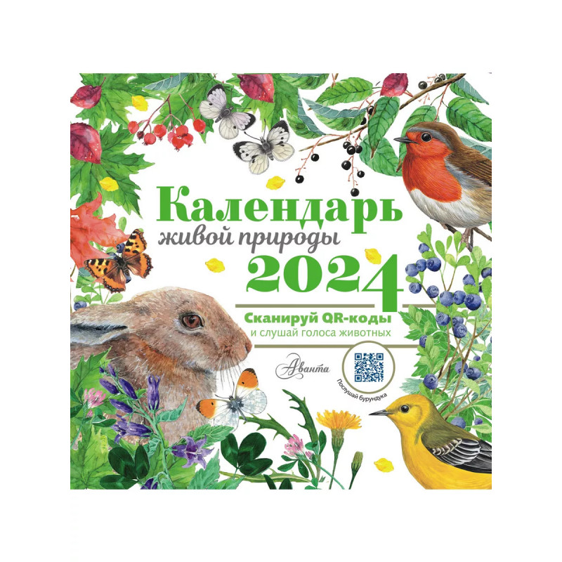 Календарь живой природы с голосами животных 2024 год. Каждый год редакция "Аванты" делает заново удивительный познавательный календарь, который полюбился многим читателям. Ведь в этом календаре собрана интересная и полезная для всех любителей природы, в том числе самых юных, разнообразнейшая нформация о нашей природе: факты, легенды, праздники, народные приметы, наблюдения за погодой. В календаре намечены примерные сроки прилёта и отлёта птиц, цветения растений и и другие природные явления. Каждый месяц календаря украшают удивительные по красоте и реалистичности иллюстрации, а также прекрасные стихи о природе русских поэтов. Дополняют каждый месяц OR-коды с голосами птиц и зверей. Для всех любителей природы, для школьников младшей школы и средней школы