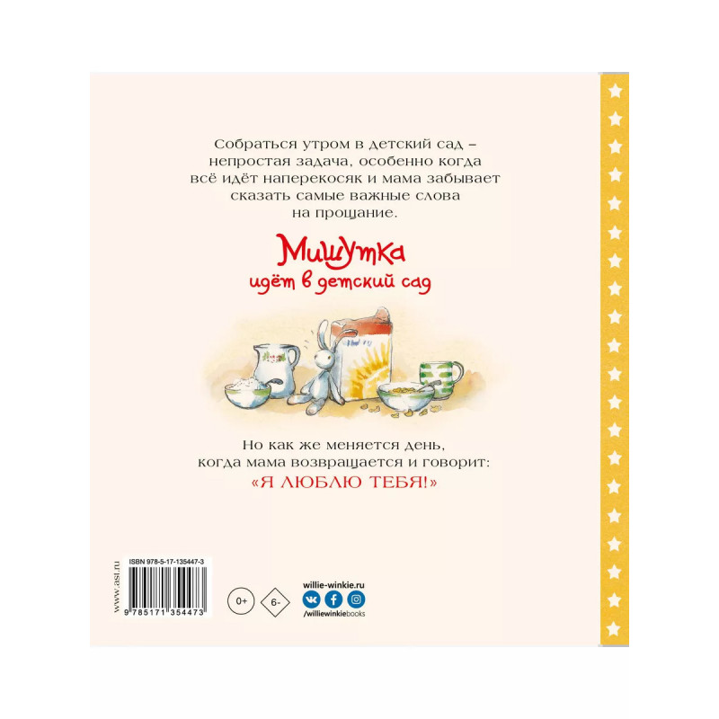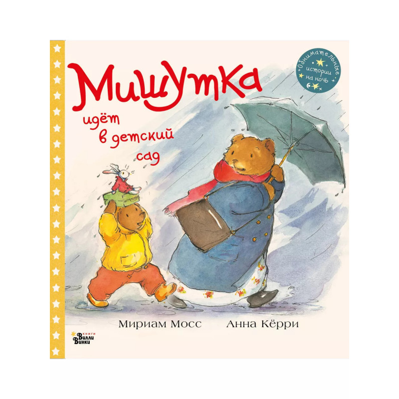 Мишутка идет в детский сад. Мама-медведица и Мишутка очень опаздывают. Хотя Мишутка и говорит, что это всё вина Кролика, он очень медленно ел свой завтрак.И теперь им придётся бежать, чтобы успеть в детский сад. Но вот незадача, в этой спешке мама забывает сказать Мишутке кое-что важное... "Мишутка идет в детский сад" - это тёплая история о родительской любви от любимого детского автора Мириам Мосс с очаровательными иллюстрациями Анны Керри, выполненными в олдскульном стиле.