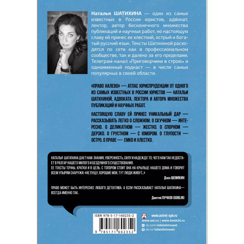 Наталья Шатихина, один из самых известных юристов России, ведущая популярного телегpам-канала "Приговорчики в строю", выпустила книгу о юриспруденции, в которой она разбирает реалистичные кейсы, доступным для понимания языком объясняет структуру и работу системы. Емко, легко и всегда с юмором.