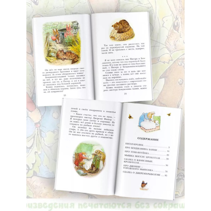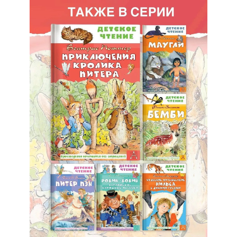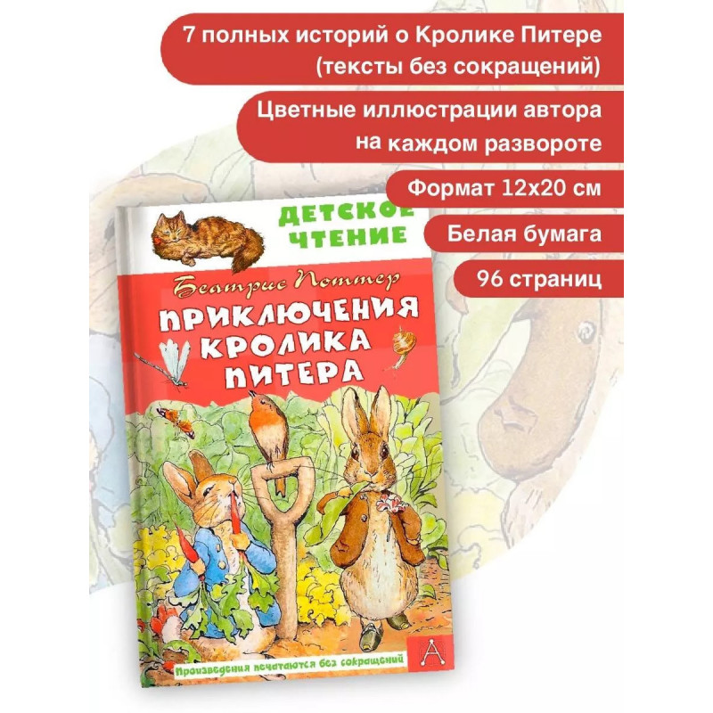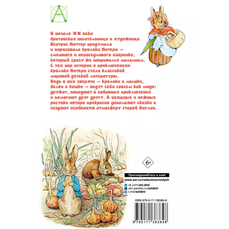 Приключения кролика Питера. Беатрис Поттер (1866-1943) - знаменитая британская писательница и художница. В начале XX века она придумала и нарисовала кролика Питера - смешного и непоседливого озорника, который сразу же понравился малышам. С тех пор истории о приключениях кролика Питера стали классикой мировой детской литературы. Ведь в них зверята - кролики и мышки, белки и кошки - ведут себя совсем как люди: дружат, попадают в забавные приключения и помогают друг другу. А изящные и нежные рисунки автора прекрасно дополняют сказки и создают особенную атмосферу старой Англии. В эту книгу вошли сказки "Питер-кролик", "Про Бенджамина Банни", "Про Тома-котёнка" и другие - в великолепном переводе И. П. Токмаковой.