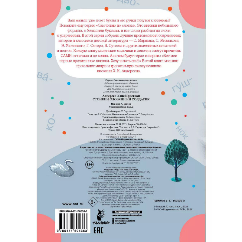 Стойкий оловянный солдатик. Крупный шрифт, разбивка на слоги, ударения, запоминающиеся цветные иллюстрации - в книгах серии "Сам читаю по слогам" есть всё необходимое для формирования у ребенка прочного навыка чтения и стимулирования устойчивого интереса к книге. А еще это прекрасная возможность познакомиться с лучшими произведениями любимых детских авторов, многие из которых стали неотъемлемой частью отечественной культуры. Знать их - признак образованного, культурного человека. Идеальное сочетание "цена-качество! Книги не будут обременительны для семейного бюджета и принесут массу пользы, создадут прекрасное настроение. Волшебная сказка Х. К. Андерсена станет лучшей историей для первого чтения.