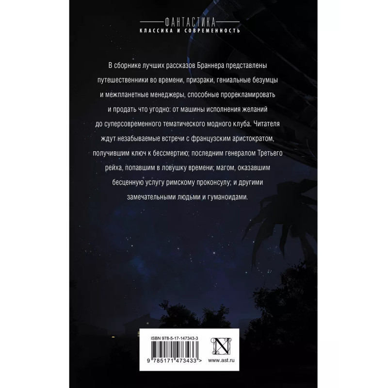 В сборнике лучших рассказов Браннера представлены путешественники во времени, призраки, гениальные безумцы и межпланетные менеджеры, способные прорекламировать и продать что угодно: от машины исполнения желаний до суперсовременного тематического модного клуба. Читателя ждут незабываемые встречи с французским аристократом, получившим ключ к бессмертию, последним генералом Третьего Рейха, попавшим в ловушку времени, магом, оказавшим бесценную услугу римскому проконсулу, и другими замечательными людьми и гуманоидами.