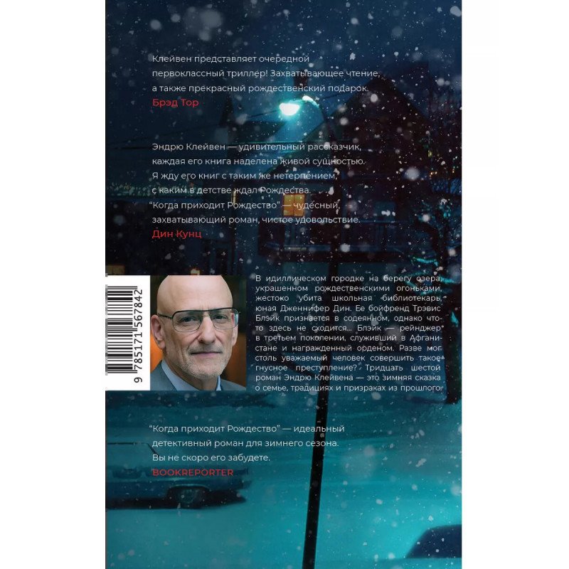 Когда приходит Рождество. "Трэвис Блэйк, рейнджер третьего поколения, получивший орден за проявление героизма в Афганистане, признался в жестоком убийстве своей девушки о том, что бросил ее тело в это большое озеро" - новость взбудоражившая весь небольшой Свит-Хейвен. Никто не в силах поверить, что Блэйк способен такое совершить. Не верит в это и его адвокат. Она обращается за помощью к своему бывшему бойфренду: его особенный тип мышления должен найти разгадку. "Когда приходит Рождество" - идеальный детективный роман для зимнего сезона. Вы нескоро его забудете" (Bookreporter). Это тридцать шестая книга американского писателя и сценариста, двукратного лауреата премии Эдгара Аллана По - Эндрю Клейвена. Он известен своими произведениями в стиле мистического триллера или психологического нуара.