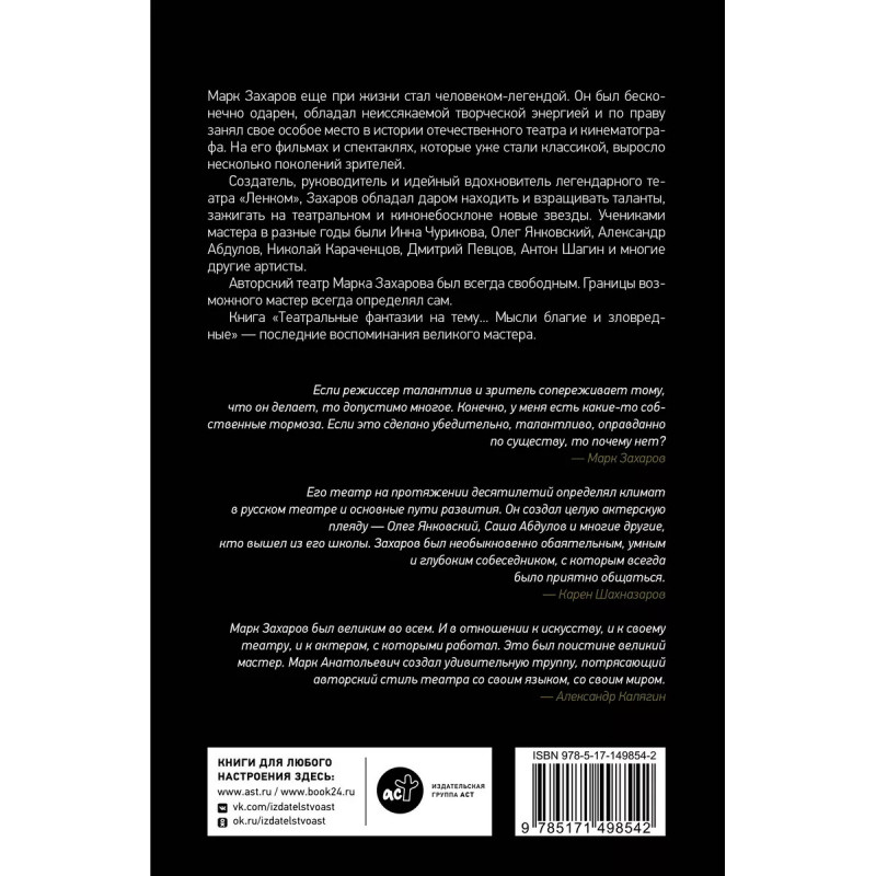 Театральная фантазия на тему...Мысли благие и зловредные. Марк Захаров еще при жизни стал человеком-легендой. Он был бесконечно одарен, обладал неиссякаемой творческой энергией, по праву заняв свое особое место в истории отечественного театра и кинематографа. На его фильмах и спектаклях, которые уже стали классикой, выросло несколько поколений зрителей. Создатель, руководитель и идейный вдохновитель легендарного театра "Ленком", Захаров обладал даром находить и взращивать таланты, зажигать на театральном и кино небосклоне новые звезды. Учениками мастера в разные годы были Инна Чурикова, Олег Янковский, Александр Абдулов, Николай Караченцов, Дмитрий Певцов, Антон Шагин и многие другие артисты. Авторский театр Марка Захарова был всегда свободным. Границы возможного мастер всегда определял сам. Книга "Театральные фантазии на тему... Мысли благие и зловредные" - последние воспоминания великого мастера.