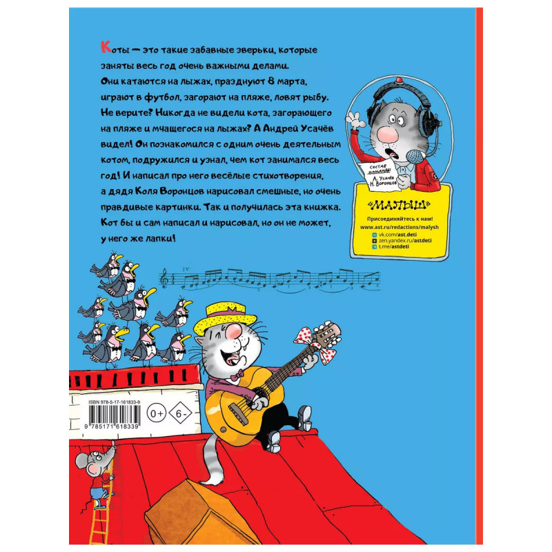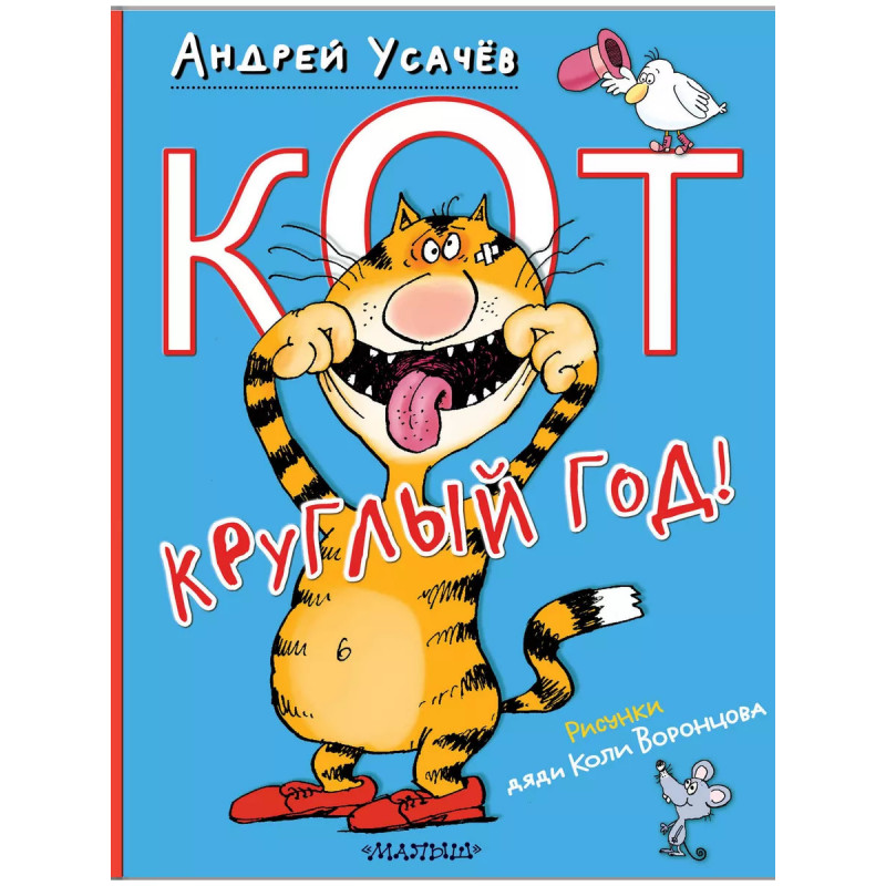Кот круглый год!. Коты - это такие забавные зверьки, которые заняты весь год очень важными делами. Они катаются на лыжах, празднуют 8 марта, играют в футбол, загорают на пляже, ловят рыбу. Не верите? Никогда не видели кота, загорающего на пляже и мчащегося на лыжах? А Андрей Усачёв видел! Он познакомился с одним очень деятельным котом, подружился и узнал, чем кот занимался весь год! И написал про него весёлые стихотворения, а дядя Коля Воронцов нарисовал смешные, но очень правдивые картинки. Так и получилась эта книжка. Кот бы и сам написал и нарисовал, но он не может, у него же лапки!