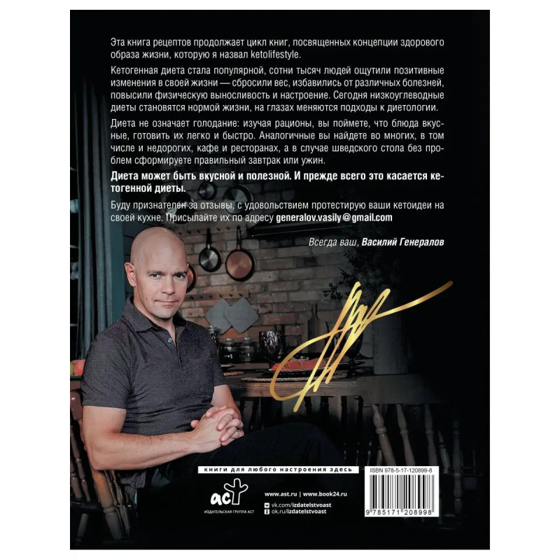 Василий Генералов невролог, эпилептолог, доктор медицинских наук, профессор, специалист интегративной медицины, автор бестселлера Кетодиета. Есть жир можно! Генералов руководит клиникой, в которой успешно помогает больным сахарным диабетом, эпилепсией, аутизмом, ожирением и еще целым рядом заболеваний. В своей практике В. Генералов применяет концепцию здорового питания, основанного на кеторационах.
