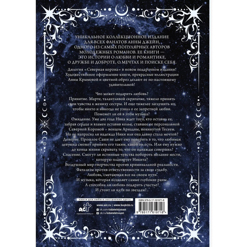 Северная корона. Дилогия в одном томе.. Два шедевра Анны Джейн "Северная корона. По звездам" и "Северная корона. Против ветра" не просто в одном томе, но и в подарочном издании. Счастье и долг? Талант и деньги? Воздушный мир музыки и запретный преступный мир - кто из героев способен переступить черту дозволенного ради любви, счастья, корысти или мести? Сестры Ника и Марта оказываются втянуты в водоворот страсти, интриг и чужих игр. Обеим героиням предстоит сделать сложный выбор между музыкой сердца и голосом разума. Какие решения они примут? Смогут ли они найти свое счастье? И какую роль в их судьбах играет ветер - то ласковый, то свирепый? Читайте в издании Анны Джейн "Северная корона. Дилогия в одном томе".