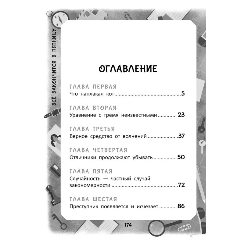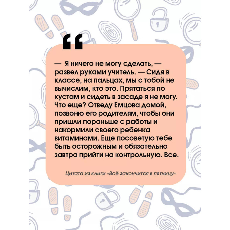 Всё закончится в пятницу. Детективы бывают разные: полицейские, когда за дело берутся профессионалы; сыщицкие, где работает специалист-одиночка; любительские, если следствие ведет дилетант... А у нас преступления расследуют одноклассники. Страшная беда нависла над отличниками седьмых классов, со дня на день изведут всех, и девчонок не пожалеют. Кто-то должен остановить злодея!