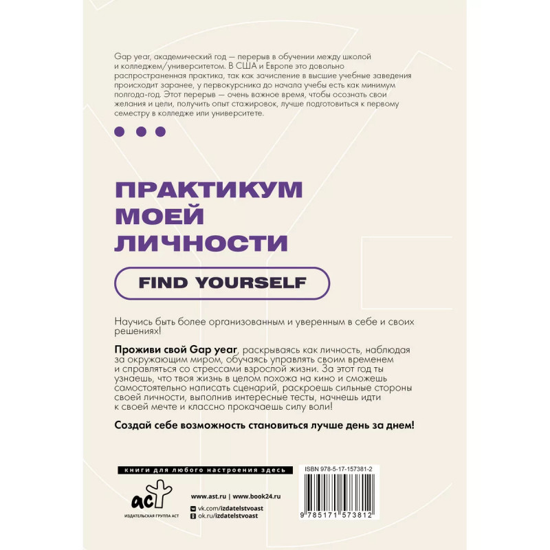 Практикум моей личности. Find yourself. Gap year, академический год - перерыв в обучении между школой и колледжем, университетом. В США и Европе это довольно распространенная практика, так как зачисление в высшие учебные заведения происходит заранее, у первокурсника до начала учебы есть как минимум полгода-год. Этот перерыв - очень важное время, чтобы осознать свои желания и цели, получить опыт стажировок, лучше подготовиться к первому семестру в колледже или университете. Научись быть более организованным и уверенным в себе и своих решениях! Проживи свой Gap year, раскрываясь как личность, наблюдая за окружающим миром, обучаясь управлять своим временем и справляться со стрессами взрослой жизни. За этот год ты узнаешь, что твоя жизнь в целом похожа на кино и сможешь самостоятельно написать сценарий, раскроешь сильные стороны своей личности, выполнив интересные тесты, начнешь идти к своей мечте и классно прокачаешь силу воли! Создай себе возможность становиться лучше день за днем!