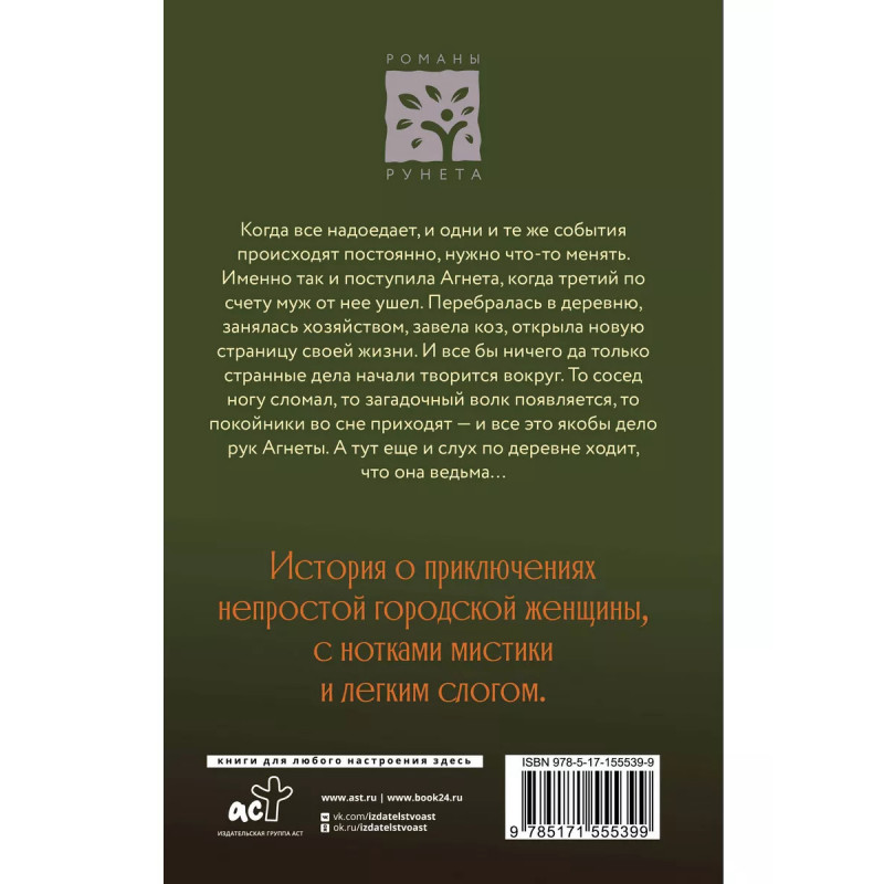 Ведьма Агнета. Когда все надоедает, и одни и те же события происходят постоянно, нужно что-то менять. Именно так и поступила Агнета, когда третий по счету муж от нее ушел. Перебралась в деревню, занялась хозяйством, завела коз, открыла новую страницу своей жизни. И все бы ничего да только странные дела начали творится вокруг. То сосед ногу сломал, то загадочный волк появляется, то покойники во сне приходят - и все это якобы дело рук Агнеты. А тут еще и слух по деревне ходит, что она ведьма История о приключениях непростой городской женщины, с нотками мистики и легким слогом.