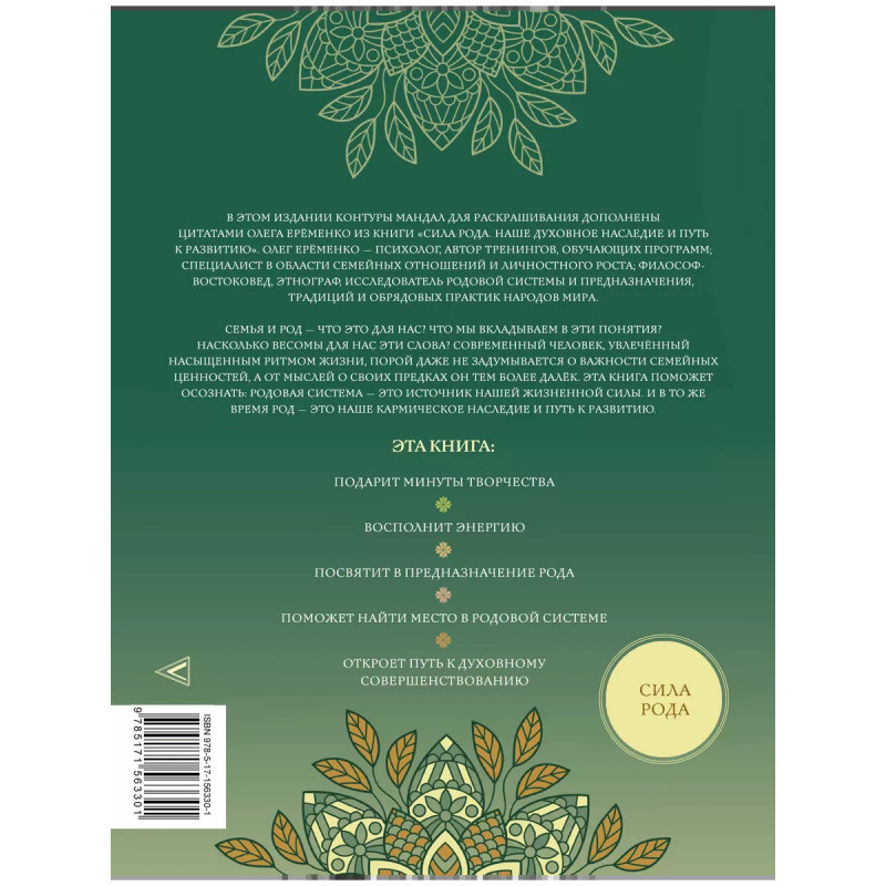 Мандалы энергии Рода. Твое духовное наследие. В этом издании контуры мандал для раскрашивания дополнены цитатами Олега Ерёменко из книги "Сила рода. Наше духовное наследие и путь к развитию". Олег Ерёменко - психолог, автор тренингов, обучающих программ; специалист в области семейных отношений и личностного роста; философ-востоковед, этнограф, исследователь Родовой системы и предназначения, традиций и обрядовых практик народов мира. Семья и Род - что это для нас? Что мы вкладываем в эти понятия? Насколько весомы для нас эти слова? Современный человек, увлечённый насыщенным ритмом жизни, порой даже не задумывается о важности семейных ценностей, а от мыслей о своих предках он тем более далёк. Эта книга поможет осознать: Родовая система - это источник нашей жизненной силы. И в то же время Род - это наше кармическое наследие и путь к развитию.