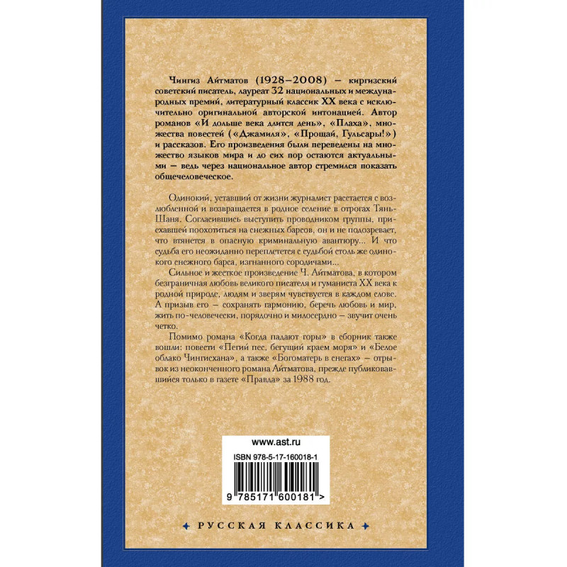 Когда падают горы. Одинокий, уставший от жизни журналист расстается с возлюбленной и возвращается в родное селение в отрогах Тянь-Шаня. Согласившись выступить проводником группы, приехавшей поохотиться на снежных барсов, он и не подозревает, что втянется в опасную криминальную авантюру И что судьба его неожиданно переплетется с судьбой столь же одинокого снежного барса, изгнанного сородичами Сильное и жесткое произведение Ч. Айтматова, в котором безграничная любовь великого писателя и гуманиста XX века к родной природе, людям и зверям чувствуется в каждом слове. А призыв его - сохранять гармонию, беречь любовь и мир, жить по-человечески, порядочно и милосердно - звучит очень четко. Помимо романа "Когда падают горы" в сборник также вошли: повести "Пегий пес, бегущий краем моря" и "Белое облако Чингисхана", а также "Богоматерь в снегах" - отрывок из неоконченного романа Айтматова, прежде публиковавшийся только в газете "Правда" за 1988 год.