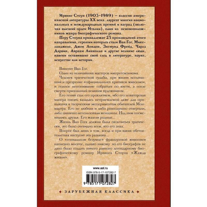 Жажда жизни. Винсент Ван Гог. Один из величайших мастеров импрессионизма. Человек трагической судьбы, при жизни испытавший и презрение "официальных" критиков живописи, и полное непонимание собратьев по кисти, а после смерти признанный великим художником. Его гений стал проклятием, ибо его новаторская манера писать казалась неприемлемой даже для привыкших к творческим эксперимен-там обитателей Монмартра. Его не любили и либо равнодушно отвергали, либо цинично использовали женщины. Над ним посмеивались друзья. Его жалели родные Жизнь Ван Гога должна была окончиться трагически, это было очевидно всем, кто его знал. Вопрос лишь в том, когда и при каких обстоятельствах наступит эта развязка О "гениальном безумце" французской живописи написано многое, однако никому из его биографов не дано было создать ничего равного легендарному биографическому роману Ирвинга Стоуна "Жажда жизни".