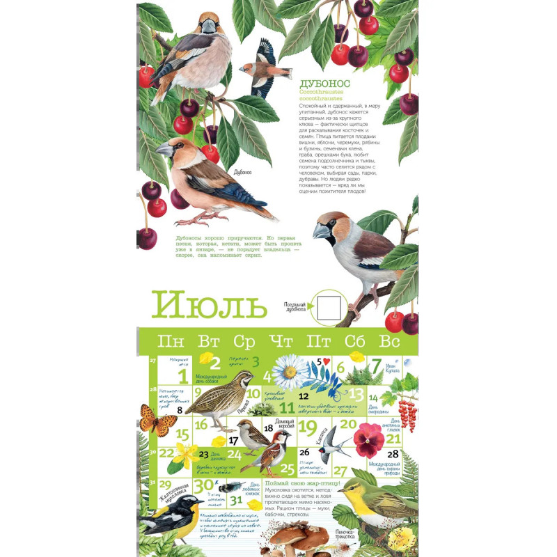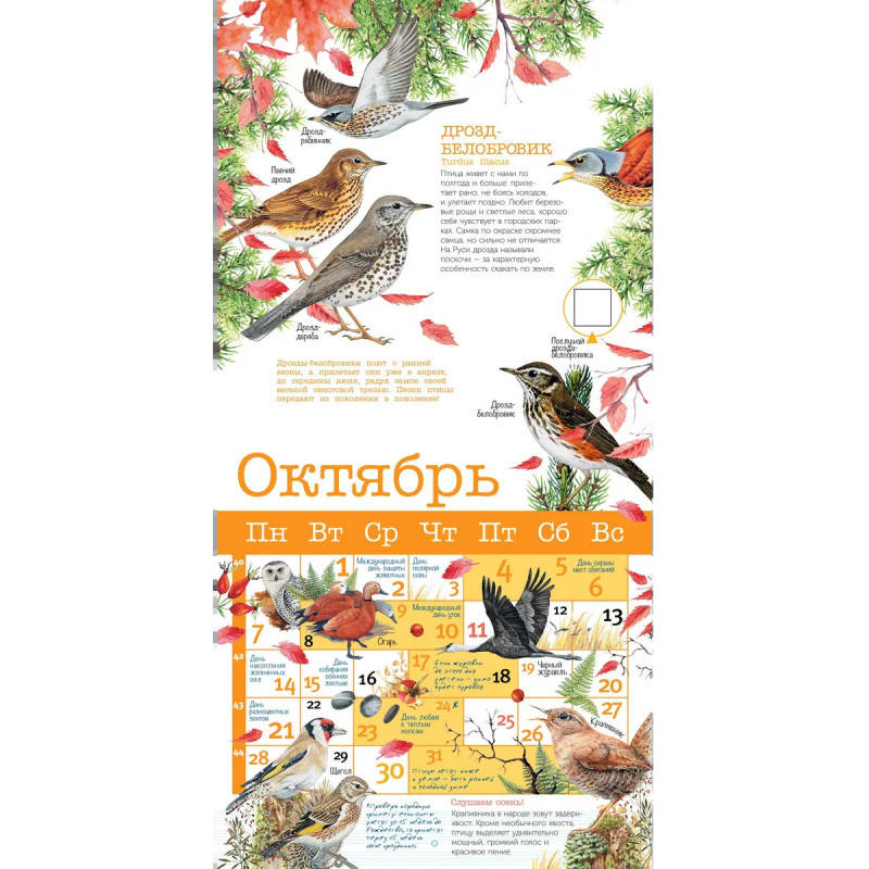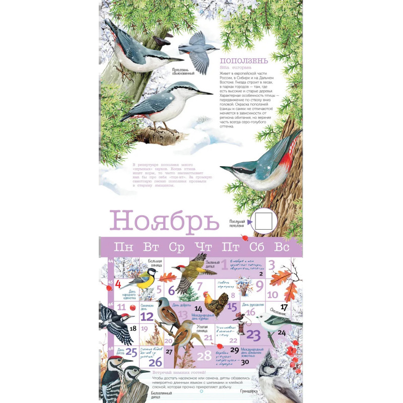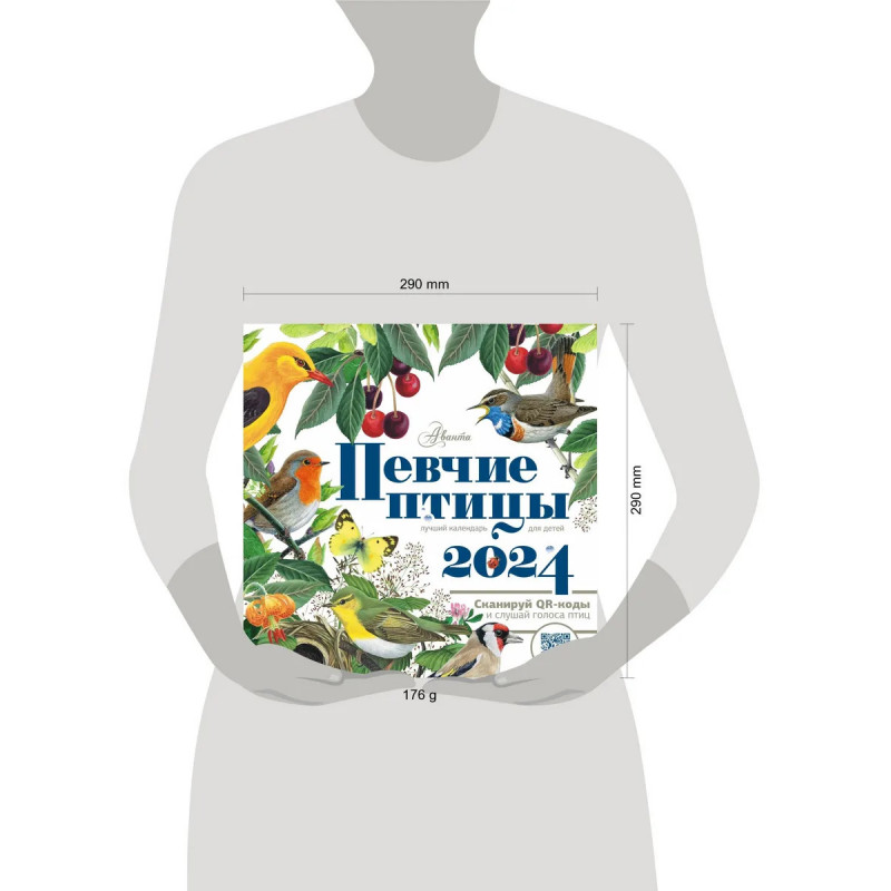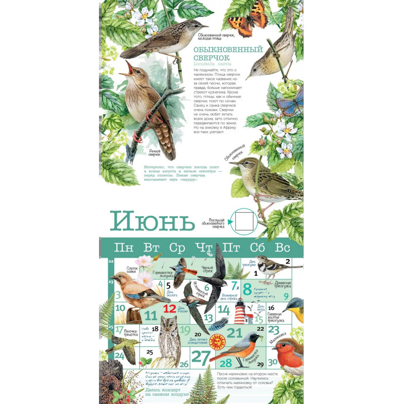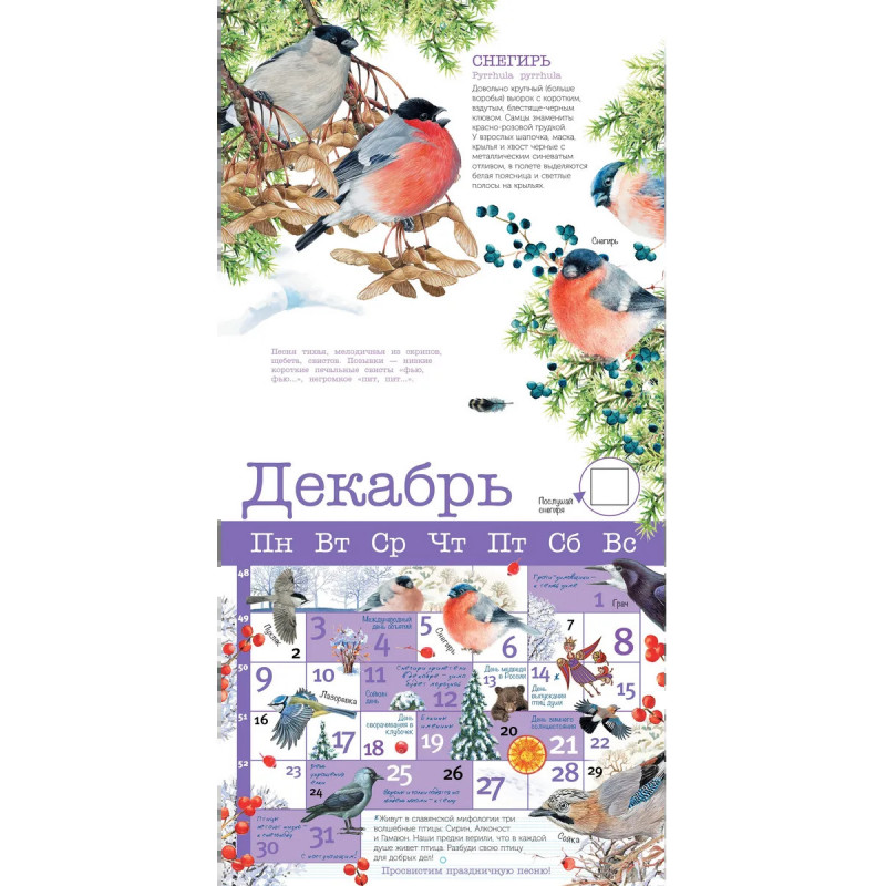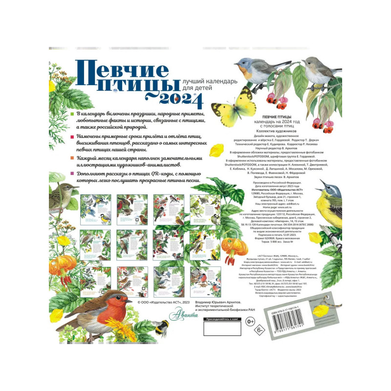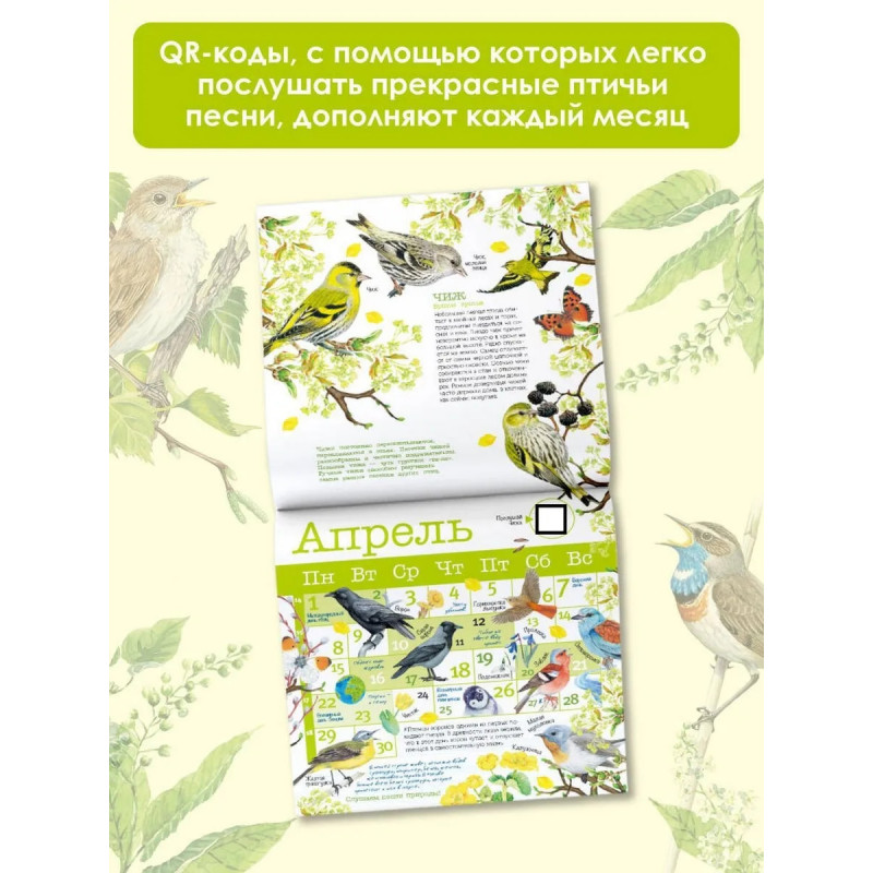 Календарь настенный Певчие птицы с голосами 2024 год. Познавательный календарь для школьников и всех любителей родной природы порадует интересной информацией, легендами, необычными праздниками, народными приметами, связанными с птицами нашей страны. В календаре много самой разнообразной информации о певчих птицах и их песнях, а также замечательные иллюстрации художников-анималистов. Все месяцы календаря посвящены известным певчем птицам, песни которых можно легко прослушать с помощью QR--кодов. Прекрасный подарок для любителей природы, а также в школьный класс начальной школы или кабинет биологии.