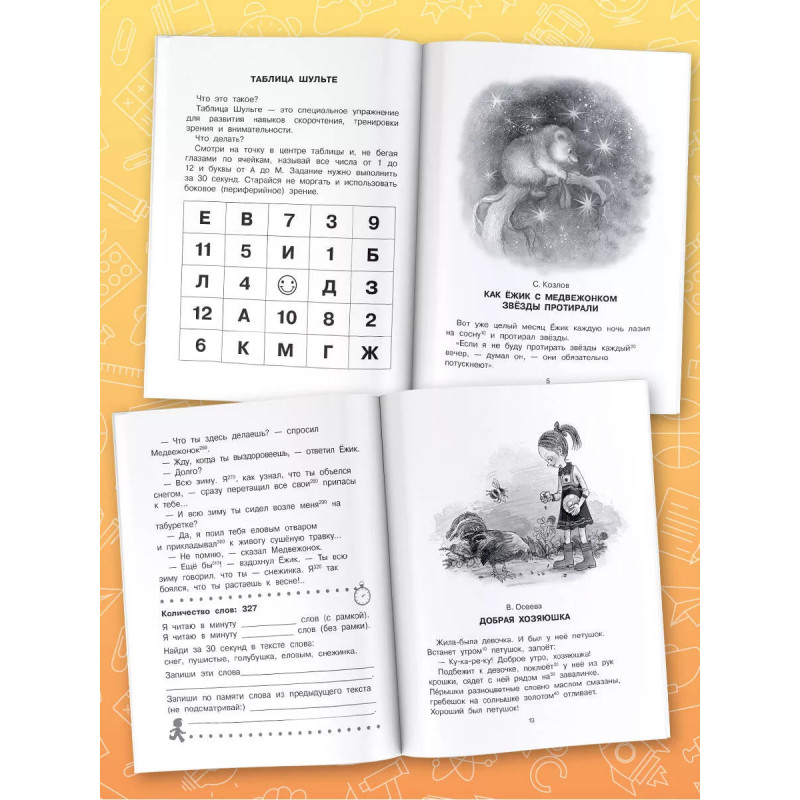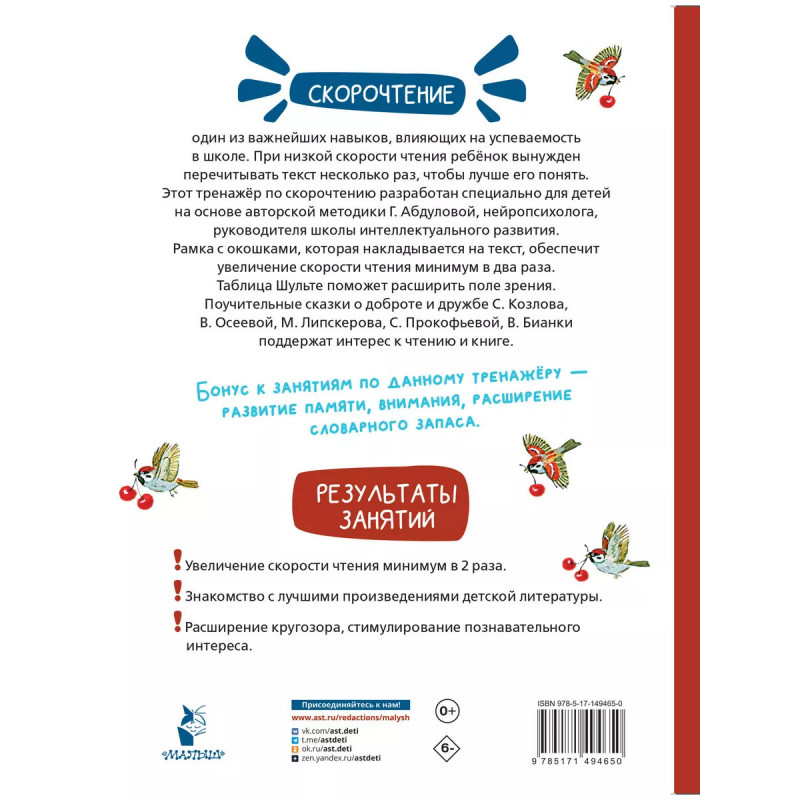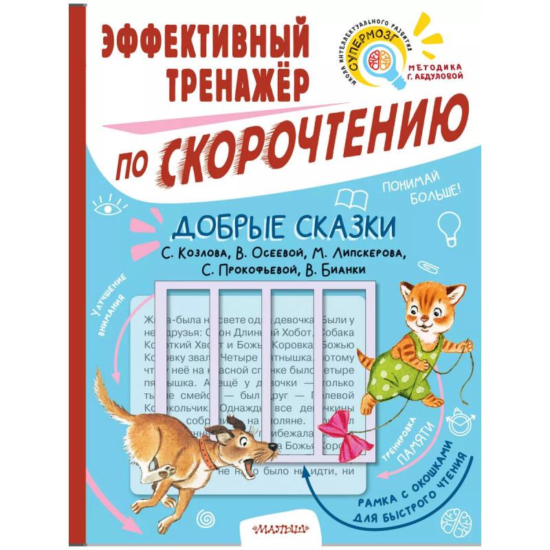 Добрые сказки. Эффективный тренажер по скорочтению. 7 причин купить книгу: - Увеличение скорости чтения минимум в два раза. - Знакомство с лучшими произведениями детской литературы. - Развитие памяти, внимания, познавательного интереса, увеличение словарного запаса. - Таблица Шульте для расширения поля зрения. - Специальная рамка с окошками, которая накладывается на текст, и позволяет значительно улучшить технику чтения. - Занятия по авторской методике Г. Абдуловой, нейропсихолога, руководителя школы интеллектуального развития, - Тренировка одного из самых важных навыков для успешного обучения в школе.