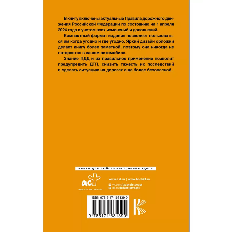 В книгу включены актуальные Правила дорожного движения Российской Федерации по состоянию на 1 апреля 2024 года с учетом всех изменений и дополнений. Компактный формат издания позволяет пользоваться им когда угодно и где угодно. Яркий дизайн обложки делает книгу более заметной, поэтому она никогда не потеряется в вашем автомобиле. Знание ПДД и их правильное применение позволит предупредить ДТП, снизить тяжесть их последствий и сделать ситуацию на дорогах еще более безопасной. Издание учитывает все изменения, опубликованные в официальных источниках на момент подписания издания в печать.