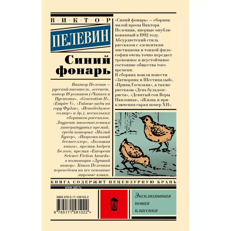 Синий фонарь. - От автора романов "Generation "П"", "Чапаев и Пустота", "Empire V", "S.N.U.F.F.", "iPhuck 1" и многих других. - Первая книга малой прозы Виктора Пелевина - сборник рассказов, опубликованный в 1992 году и принёсший автору известность и "Малый Букер". - В сборник вошли культовые повести "Затворник и Шестипалый" и "Принц Госплана". - Виктор Пелевин - русский писатель, эссеист и постмодернист, автор множества романов, лауреат многочисленных литературных премий. Его книги обсуждают, переводят и читают по всему миру.