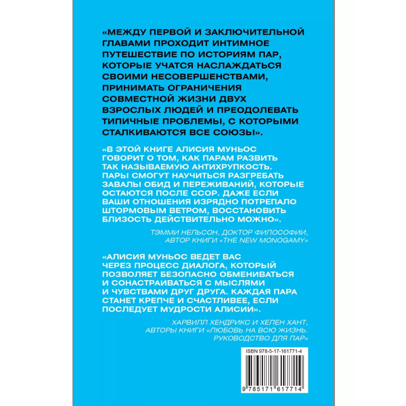 Говорят, что любовь длится только три года. Дальше даже самые страстные отношения превращаются в рутину, начинают вызывать раздражение, тяготят. Но если вы сможете правильно пережить это сложное время, ваша пара обретет "антихрупкость", и никакие жизненные испытания уже не смогут разлучить вас. Алисия Муньос - психотерапевт, сексолог, международный специалист в области отношений - обучит вас навыкам, необходимым для поддержания счастливых и здоровых отношений. В книге 52 главы, в которые включены яркие описания ситуаций, краткие результаты исследований на тему и упражнения, позволяющие справиться с проблемой. Узнайте больше о психологии отношений и укрепите свою связь! Что такое здоровые любовные отношения, совместимость в любовных отношениях? Как понять свою половинку? Как развить "антихрупкость"? На эти и многие другие вопросы вы найдете ответы в этой книге. Прочтите книгу и узнайте, что необходимо для счастливой и долгой любви! Отзыв от Харвилл Хендрикс и Хелен Хант, авторов книги "Любовь на всю жизнь. Рук