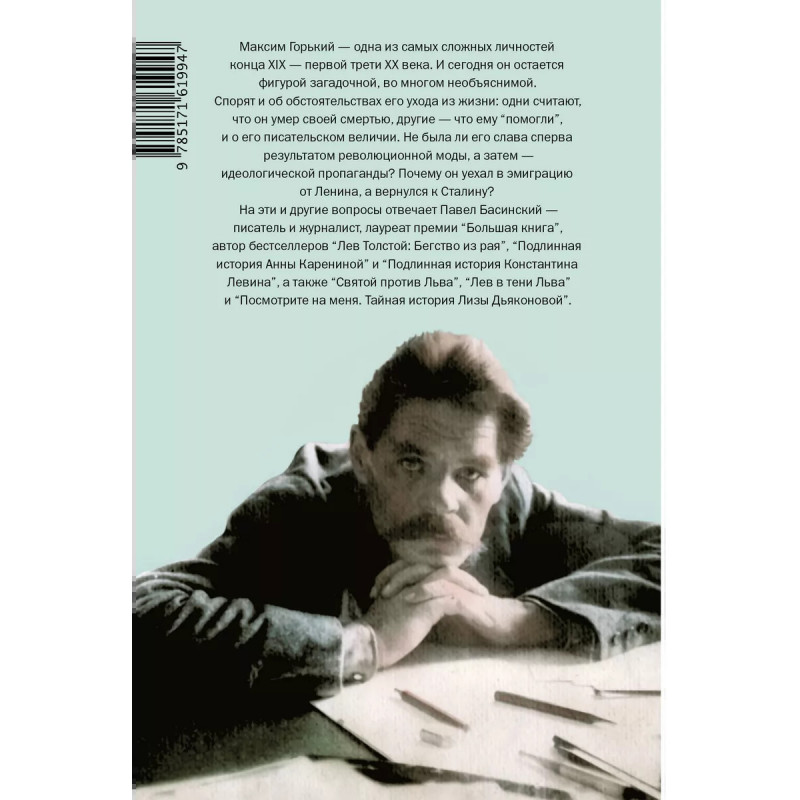 Горький : Страсти по Максиму. Максим Горький - одна из самых сложных личностей конца XIX - первой трети ХХ века. И сегодня он остается фигурой загадочной, во многом необъяснимой. Спорят и об обстоятельствах его ухода из жизни: одни считают, что он умер своей смертью, другие - что ему помогли, и о его писательском величии. Не была ли его слава сперва результатом революционной моды, а затем - идеологической пропаганды? Почему он уехал в эмиграцию от Ленина, а вернулся к Сталину? На эти и другие вопросы отвечает Павел Басинский - писатель и журналист, лауреат премии Большая книга, автор бестселлеров Лев Толстой: Бегство из рая, Подлинная история Анны Карениной и Подлинная история Константина Левина, а также Святой против Льва, Лев в тени Льва и Посмотрите на меня. Тайная история Лизы Дьяконовой.