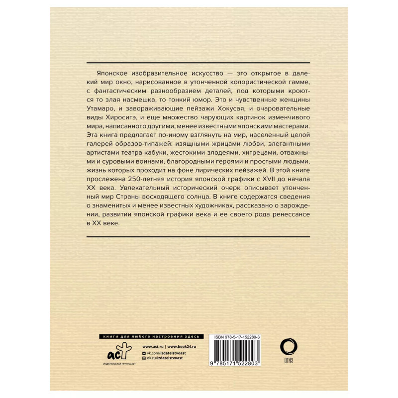 Искусство Японии. Манга. Гравюры. Начиная с XVIII века, в японском изобразительном искусстве появляется гравюра на дереве (ксилография). Сюжеты, которые вдохновляли художников, творивших в этом направлении, получили название "укиё-э" - образы изменчивого мира. В укиё-э японское искусство достигло удивительного технического совершенства, выразительности и изящности. Это открытое в далекий мир окно, нарисованное в утонченной колористической гамме, с фантастическим разнообразием деталей, под которыми кроются то злая насмешка, то тонкий юмор. Это и чувственные женщины Утамаро, и завораживающие пейзажи Хокусая и очаровательные виды Хиросигэ и еще множество чарующих картинок изменчивого мира, написанного другими, менее известными японскими мастерами. Эта книга предлагает по-иному взглянуть на мир, населенный целой галерей образов-типажей: изящными жрицами любви, элегантными артистами театра Кабуки, жестокими злодеями, хитрецами, отважными и суровыми воинами, благородными героями и простыми людьми, жизнь которых проходит на фоне лирических пейзажей
