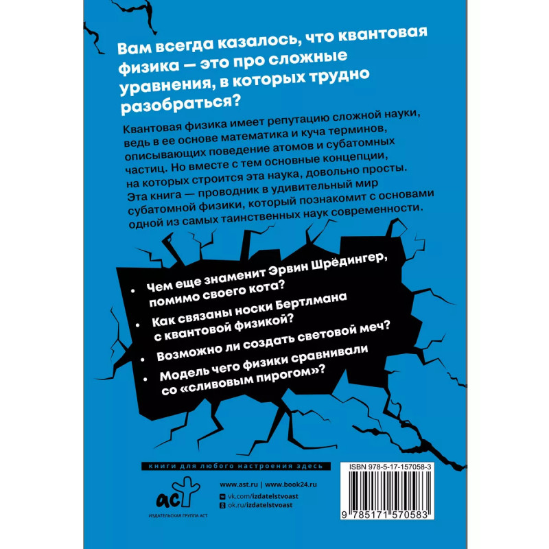 Взламывая квантовую физику. Квантовая физика имеет репутацию сложной науки, ведь в ее основе математика и куча терминов, описывающих поведение атомов и субатомных частиц. Но вместе с тем основные концепции, на которых строится эта наука, довольно просты. Эта книга - проводник в удивительный мир субатомной физики, который познакомит с основами одной из самых таинственных наук современности. " Чем еще знаменит Эрвин Шредингер, помимо своего кота? " Как связаны носки Бертлмана с квантовой физикой? " Возможно ли создать световой меч? " Модель чего физики сравнивали со "сливовым пирогом"?