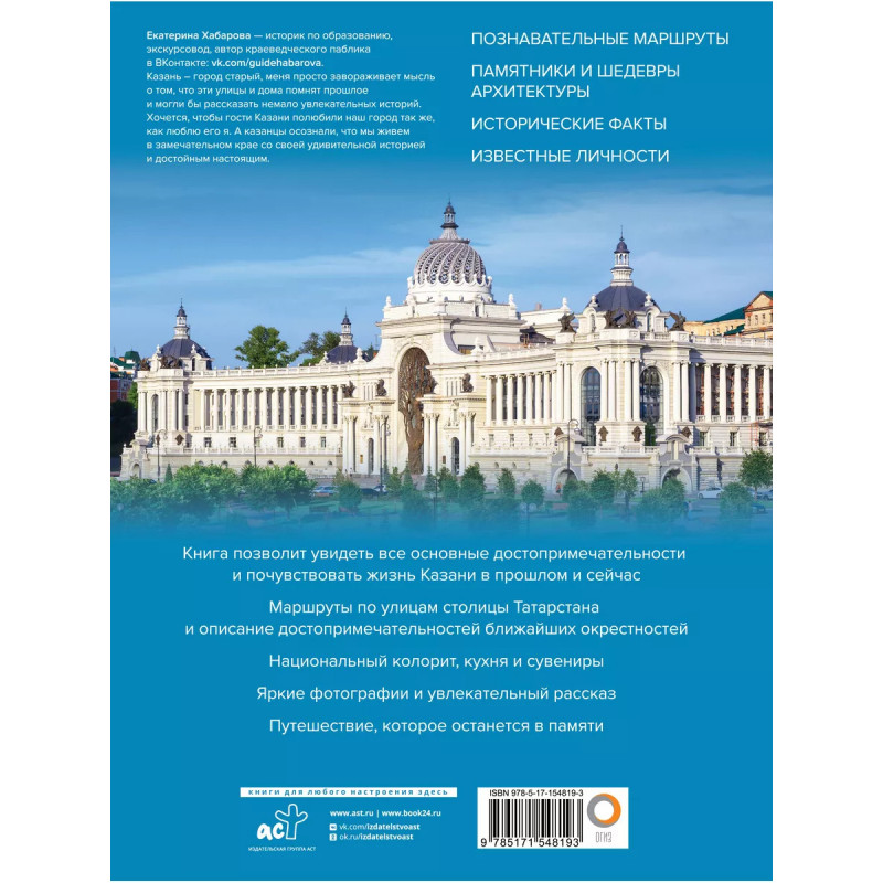 Казань. Самые красивые места. О самых красивых и интересных местах КАЗАНИ и ее окрестностях рассказано в этом издании. С помощью книги вы можете планировать маршрут прогулки по городу, узнаете, что обязательно стоит посмотреть. Этот путеводитель - отличный подарочный альбом для тех, кто любит гулять - своеобразный стимул к посещению новых интересных мест. А также замечательный подарок для тех, кто не имеет возможности для поездки в "третью столицу России", поскольку информация и фото, приведенные в книге, помогают путешествовать по Казани, не выходя из дома, погружаясь в познавательный рассказ и выразительные фотографии.