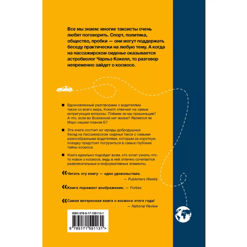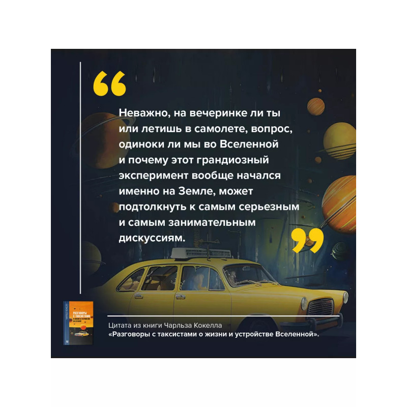 Разговоры с таксистами о жизни и устройстве Вселенной. Погружаясь в тему космоса, необязательно обременять себя вагоном академических знаний. Знаменитый астробиолог Чарльз Кокелл так полюбил разговаривать с таксистами о космосе, что собрал целый сборник бесед - забавных, остроумных и увлекательных. Оказалось, что таксисты - те еще философы и знатоки человеческих душ. А что они думают об устройстве Вселенной, инопланетянах, освоении Марса и смысле жизни? Вас ждет самая незабываемая в жизни поездка - к другим планетам, далеким галактикам и внеземным цивилизациям!