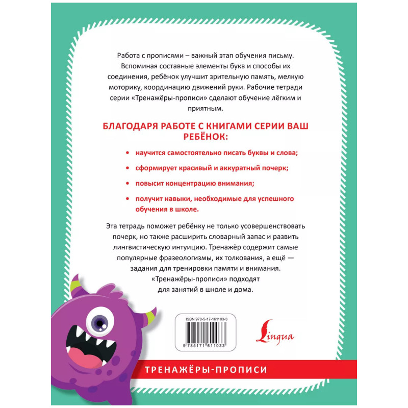 Русский язык. Учимся красиво писать фразеологизмы. Эти прописи познакомят ребёнка с самыми ходовыми фразеологизмами и станут отличным тренажёром разборчивого, красивого почерка. Текст напечатан "полупрозрачным" серым шрифтом. Обводя слова, ребёнок совершенствует почерк и доводит до автоматизма написание букв. Лексика, приведённая в издании, обогатит словарный запас школьника. Кроме того, в пособие включены задания, которые позволят развить лингвистическую интуицию, память и нестандартное мышление. Прописи предназначены для учащихся в начальной школе и соответствуют требованиям ФГОС (Федерального государственного образовательного стандарта).