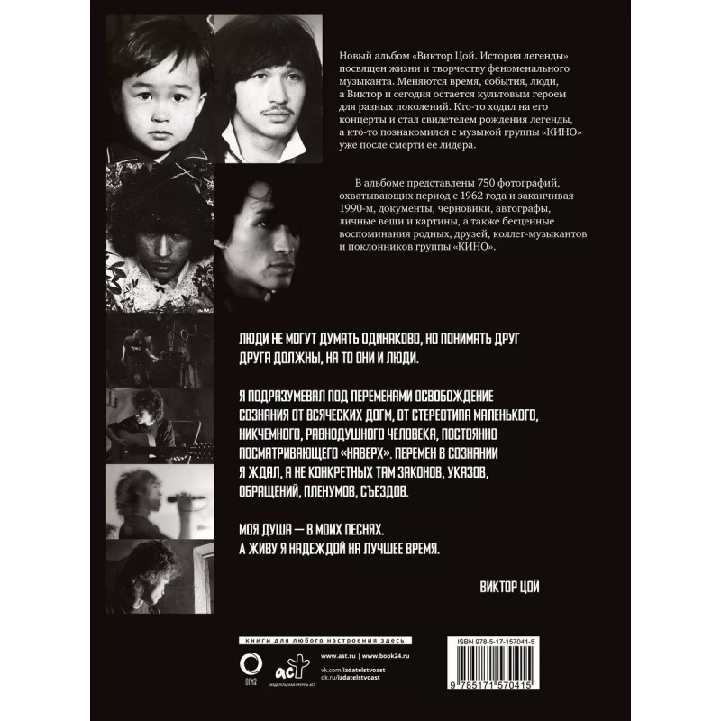 Новый альбом "Виктор Цой. История легенды" посвящен жизни и творчеству феноменального музыканта. Меняются время, события, люди, а Виктор и сегодня остается культовым героем для разных поколений. Кто-то ходил на его концерты и стал свидетелем рождения легенды, а кто-то познакомился с музыкой группы "КИНО" уже после смерти ее лидера. В альбоме представлены 750 фотографий, охватывающих период с 1962 года и заканчивая 1990-м, документы, черновики, автографы, личные вещи и картины, а также бесценные воспоминания родных, друзей, коллег-музыкантов и поклонников группы "КИНО".