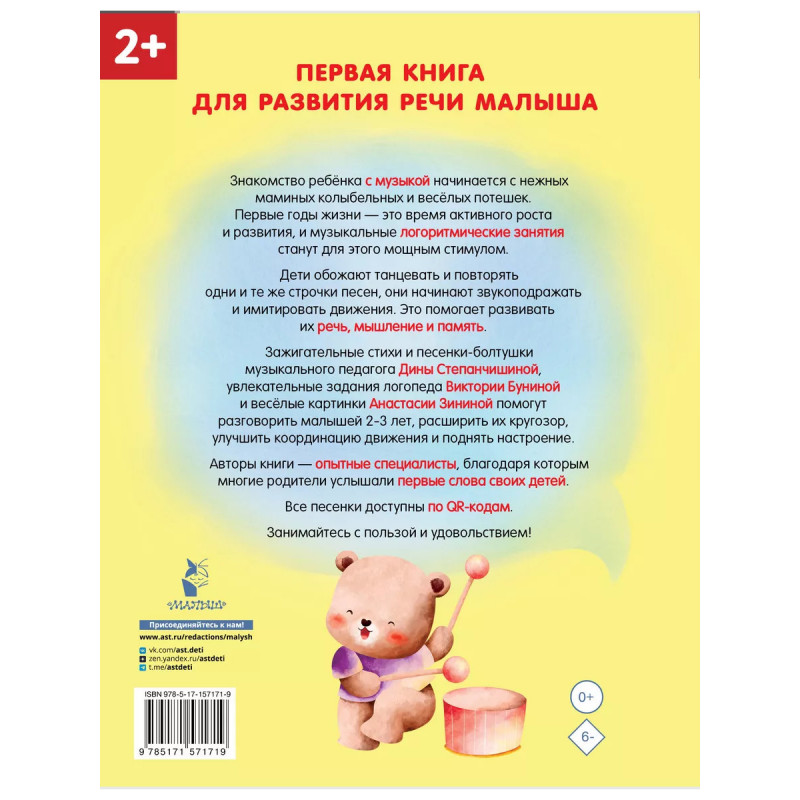 Музыка окружает ребенка с самого рождения. Колыбельная мамы, веселые песенки-потешки стимулируют развитие мозга малыша. В чем секрет магического влияния песенок на все психические процессы, особенно на память и речь? В их ритме и эмоциональной заряженности! Дети на эмоциональном подъеме начинают звукоподражать и подпевать, имитируют действия и танцуют. Под музыку включаются в игру даже самые застенчивые ребята. В этой книге собраны 30 зажигательных стихов и песенок-болтушек, доступных по QR-кодам, музыкального педагога Дины Степанчишиной, увлекательные задания логопеда Виктории Буниной и веселые картинки Анастасии Зининой. Занятия по книге помогут разговорить малышей 1-3 лет, расширят кругозор, улучшат координацию движений и поднимут настроение. Методика логоритмики, которая является научной основой книги, признана ведущими педагогами и врачами! Авторы книги опытные специалисты, благодаря которым многие родители услышали первые слова своих детей.