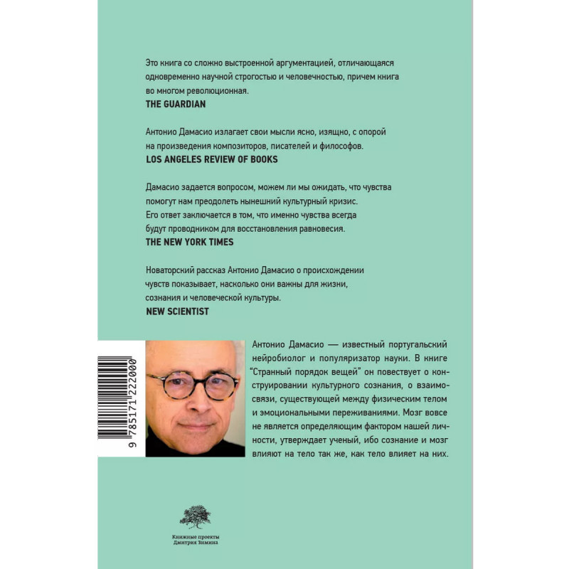 Антонио Дамасио один из авторитетнейших нейробиологов современности, известный популяризатор науки, автор нескольких научно-популярных книг. Странный порядок вещей продолжает предыдущие исследования ученого, который стремится доказать ошибочность широко распространенного представления о мозге как о компьютере, определяющем все факторы нашей жизни. Дамасио настаивает, что мозг и другие органы равны и что важно разобраться в биологической эволюции чувств, так как именно они стимулируют науку, медицину, религию и искусство. Природа чувств и происхождение культур исследуются Дамасио через призму гомеостаза, то есть способности каждого организма не только сохранять свое постоянство, поддерживая внутреннее равновесие, но и развиваться и процветать.
