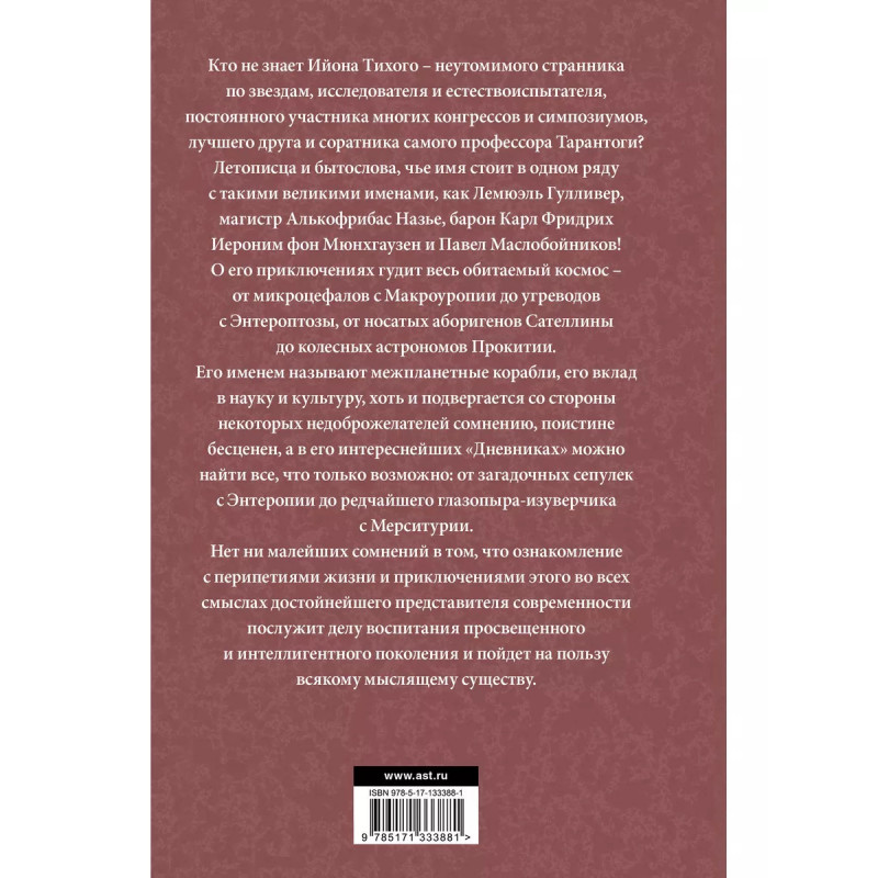 Приключения Ийона Тихого. Кто не знает Ийона Тихого - неутомимого странника по звездам, исследователя и естествоиспытателя, постоянного участника многих конгрессов и симпозиумов, лучшего друга и соратника самого профессора Тарантоги? Летописца и бытослова, чье имя стоит в одном ряду с такими великими именами, как Лемюэль Гулливер, магистр Алькофрибас Назье, барон Карл Фридрих Иероним фон Мюнхгаузен и Павел Маслобойников! О его приключениях гудит весь обитаемый космос - от микроцефалов с Макроуропии до угреводов с Энтероптозы, от носатых аборигенов Сателлины до колесных астрономов Прокитии. Его именем называют межпланетные корабли, его вклад в науку и культуру, хоть и подвергается со стороны некоторых недоброжелателей сомнению, поистине бесценен, а в его интереснейших "Дневниках" можно найти все что только возможно: от загадочных сепулек с Энтеропии до редчайшего глазопыра-изуверчика с Мерситурии. Нет ни малейших сомнений в том, что ознакомление с перипетиями жизни и приключениями этого во всех смыслах достойнейшего представителя совре