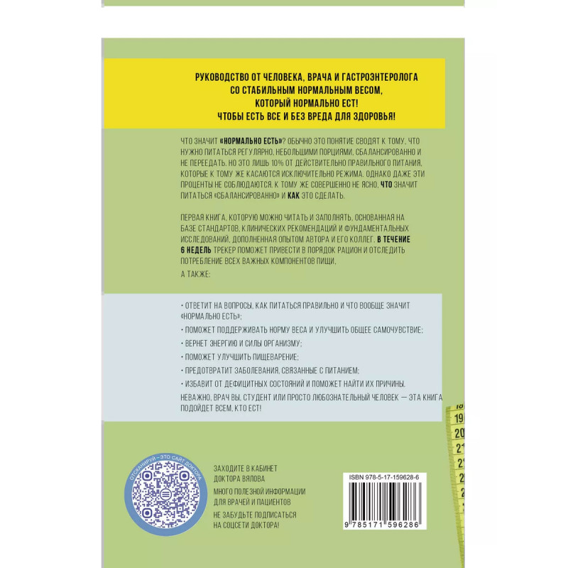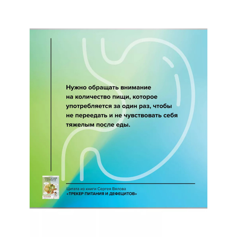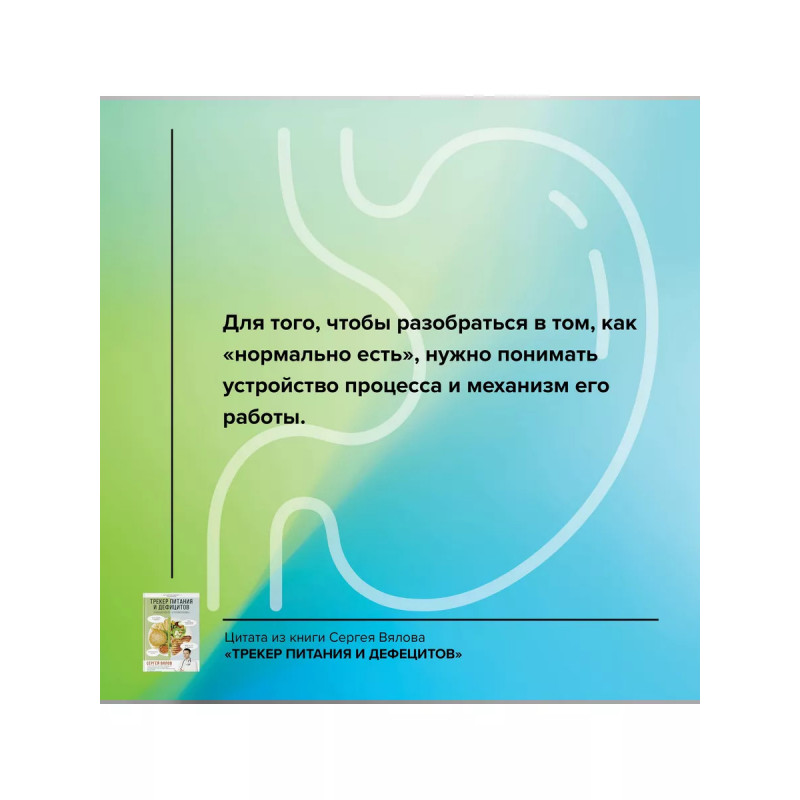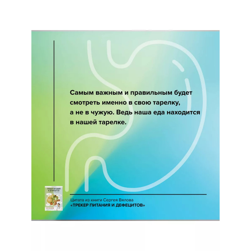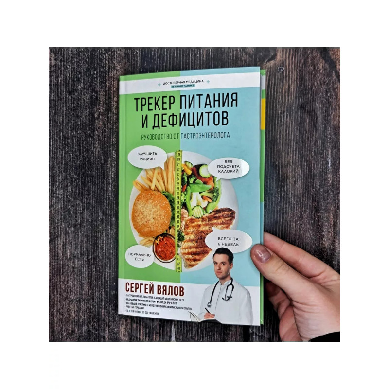 Думаете, что питаетесь правильно? Проверьте себя! Книга-трекер от доктора Вялова поможет проанализировать ваш рацион с точки зрения признанных медицинских стандартов и обнаружить пробелы в питании отсутствие дефицитов белка, углеводов и жиров, а также необходимых для здоровья витаминов и минералов. Вы сможете наладить рацион, прислушиваясь к потребностям своего организма, а не используя готовые схемы, диеты и советы сторонних людей. Трекер удобен в использовании, включает поля для заполнения и полезную информацию. С ним вы легко сможете следить за прогрессом, вовремя обнаружить дисбаланс и внести поправки в свое питание. А еще вы наглядно увидите, какие продукты и блюда способствуют вашему тонусу, а от каких лучше вовсе отказаться. Для тех, кто ищет причины проблем с пищеварением, хочет нормализовать вес и улучшить качество жизни, внимательно изучив содержимое своей тарелки!