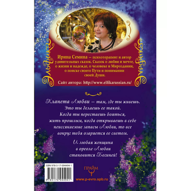 Планета Любви там, где ты живешь. Это ты делаешь ее такой. Когда ты перестаешь бояться, жить прошлым, когда открываешь в себе неиссякаемые запасы Любви, то все вокруг тебя озаряется ее светом. И любая женщина в ореоле Любви становится Богиней. О чем могут беседовать женщина, звезда, кошка и куст сирени? Конечно же, о любви! О любви к другому существу и к самой себе, о любви к Миру и о целой Планете Любви, которая, оказывается, совсем близко, стоит только протянуть руку и протереть глаза. О той любви, которой наполнена наша необъятная Вселенная, о счастье и гармонии, которые она дарит каждой из нас. А еще о том, как каждая женщина открывает в себе цветок, звезду, кошку и Богиню. Об этом и о многом другом, о том, что согревает наши души и делает их светлее, новые теплые и счастливые сказки Эльфики.