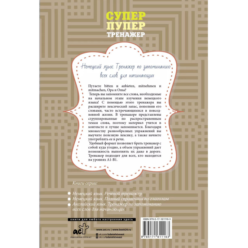Путаете bitten и anbieten, mitnehmen и mitmachen, Opa и Oma? Теперь вы запомните все слова, необходимые на начальном этапе изучения немецкого языка! С помощью этого тренажера вы расширите лексический запас, пополнив его словами, часто встречающимися в повседневной жизни. В тренажере представлены сгруппированные по распространенным темам слова, поэтому материал учится в контексте и лучше запоминается. Благодаря множеству разнообразных упражнений вы выучите полезную лексику, а также начнете употреблять ее в речи. Удобный формат позволяет брать тренажер с собой куда угодно, а объем упражнений дает возможность выполнять их даже в дороге. Тренажер подходит для всех, кто находится на уровнях А1-В1.