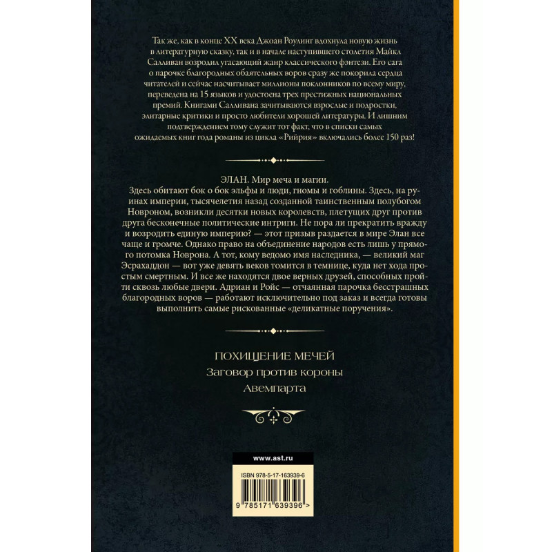 ЭЛАН. Мир меча и магии. Здесь обитают бок о бок эльфы и люди, гномы и гоблины. Здесь, на руинах империи, тысячелетия назад созданной таинственным полубогом Новроном, возникли десятки новых королевств, плетущих друг против друга бесконечные политические интриги. Не пора ли прекратить вражду и возродить единую империю? этот призыв раздается в мире Элан все чаще и громче. Однако право на объединение народов есть лишь у прямого потомка Новрона. А тот, кому ведомо имя наследника, великий маг Эсрахаддон вот уже девять веков томится в темнице, куда нет хода простым смертным. И все же находятся двое верных друзей, способных пройти сквозь любые двери. Адриан и Ройс отчаянная парочка бесстрашных благородных воров работают исключительно под заказ и всегда готовы выполнить самые рискованные "деликатные поручения".